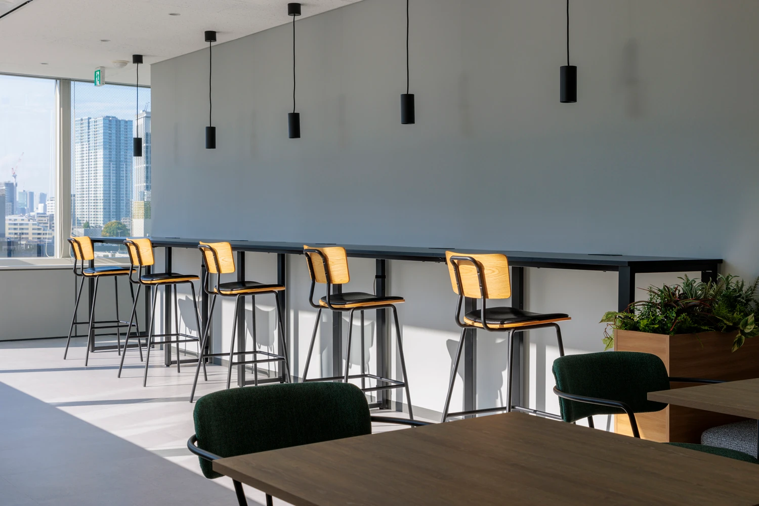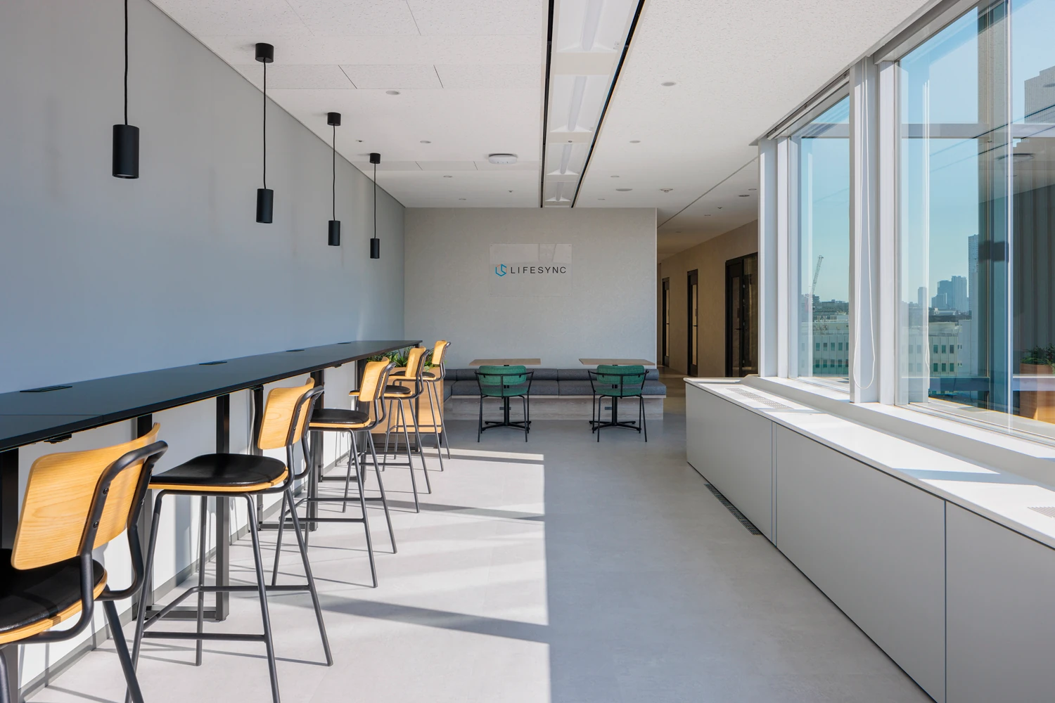 今回の移転は、増員を見据えた働きやすい環境づくりを目指したもの。創業期から使われてきた看板やデスクなどの什器をあえて転用することで、これまでの「LIFESYNC」と未来の「LIFESYNC」がつながり、調和しながら発展していく姿を表現しました。会議室の増設やフリーエリアの導入によって、多様な働き方に対応。社長室と執務室は、つながりと独立性を両立するレイアウトで組織の一体感を醸成しています。横長の区画を活かしたガラス張りの廊下は、光が抜ける開放感と未来へ視線が導かれるような期待感を生みだし、オフィス全体が『SYNC』を体現する空間となっています。