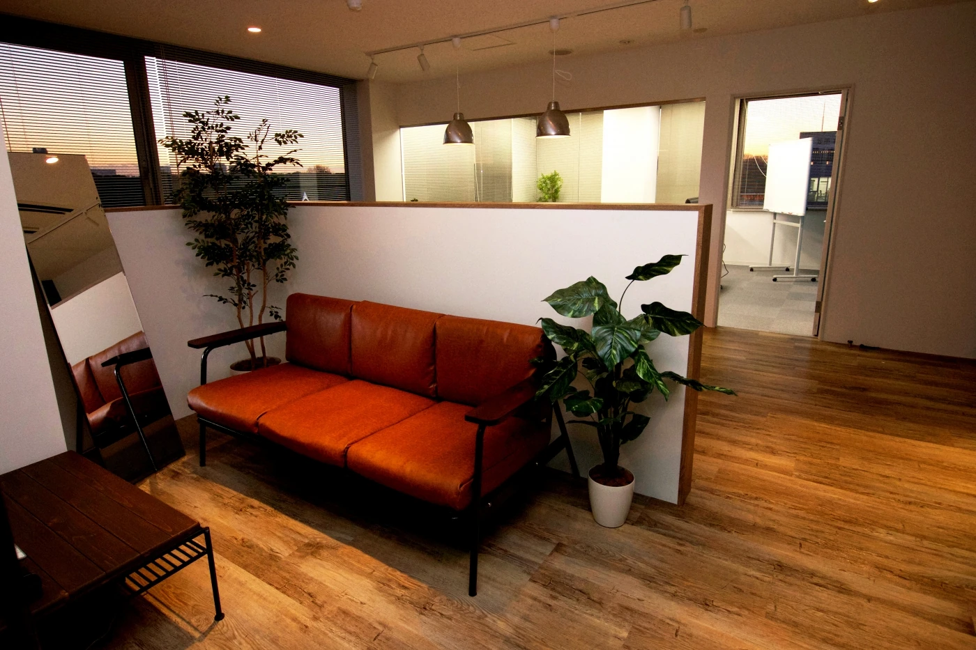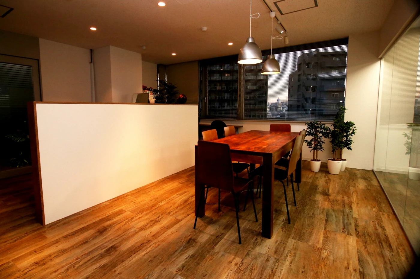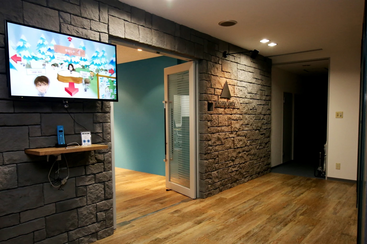 古木風の床材、規則性のないランダムサイズで構成された石タイルといった温かみのあるマテリアルを使うことで、エントランス空間に安らぎを与えました。エントランス入口には、自社制作の受付システムをモニターに映し、待ち時間にもお客様を飽きさせない、広告企画会社らしい遊び心があります。オフィス内は、一面だけをスモーキートーンのブルーのアクセントウォールで空間を印象的にデザインし、さらに照明の色温度が異なるミーティングスペースは、落ち着いた居心地の良い空間になってます。家具ひとつひとつにもこだわったオフィスインテリアは、まるでほろ苦い甘さのビターチョコレートのような、大人味のオフィス空間に仕上がりました。