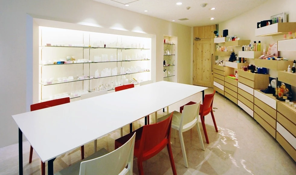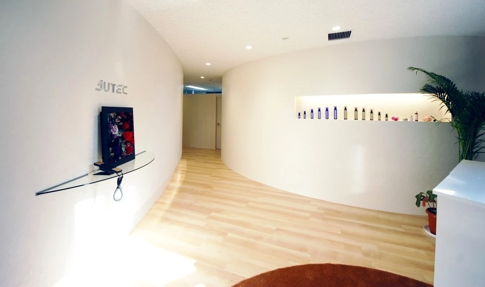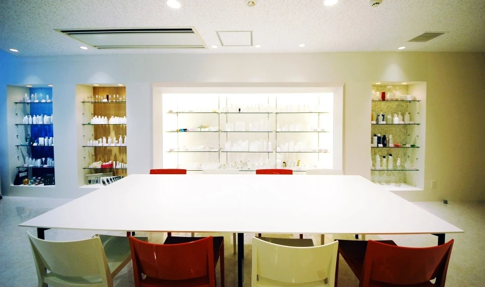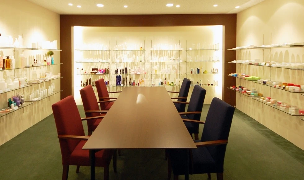 ご入居されるビルが円を1/4に切り取ったような形をしていることから、内装にR壁を採用し、訪れる方を柔らかく奥へ迎え入れるエントランスデザインにしました。2部屋あるショールーム兼商談スペースは、それぞれ全く違った表情を感じていただけるように、演出方法を変えました。採光を取り入れた明るい部屋の展示スペースの壁面には、様々なシチュエーションにてサンプル容器が展示されることを想定して、3面それぞれ異素材を施しながらも、全体的にはナチュラルテイストに。もう一方の部屋は、濃い目の素材を採用し、落ち着いた印象を与えるシックな空間にいたしました。