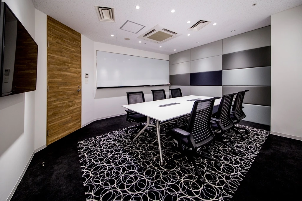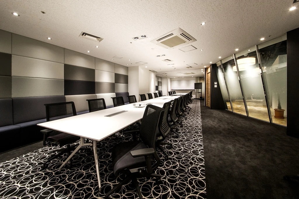 新たな移転先は、東京・麻布台のランドマークとしてそびえる黒い外壁が印象的な「NOAビル」。エレベーターホールを降りた瞬間から非日常が始まります。すり鉢状の大きな曲面で構成されたエントランスは、骨組みやスラブがむき出しの荒々しくダイナミックな空間を構築。天井はスケルトンにすることで、4mほどの高さを誇ります。4つの特徴的な会議室に施されたモノトーンの壁面パネルは、デザイン性の高い吸音材により、テレビ会議の音響を考慮したデザインに。ミーティングスペースには移動間仕切を採用し、6名から50名まで様々なシーンに対応するフレキシブルさを実現。壁面ベンチシートによって省スペースながら、収容人数も飛躍的に増やしています。スタッフが誇れる会社であると共に、来訪者を圧倒する迫力を持った、機能美あふれるデザイナーズオフィスが誕生しました。