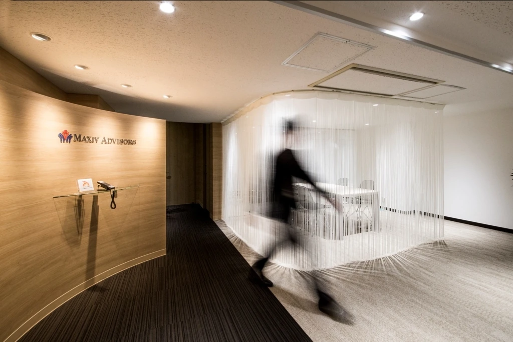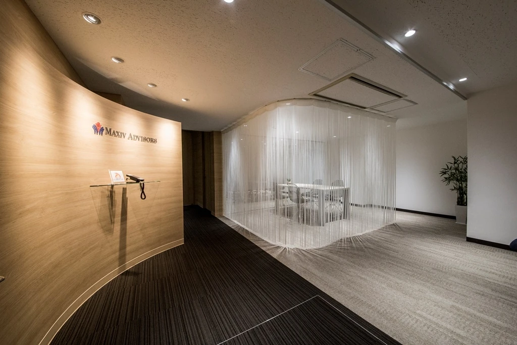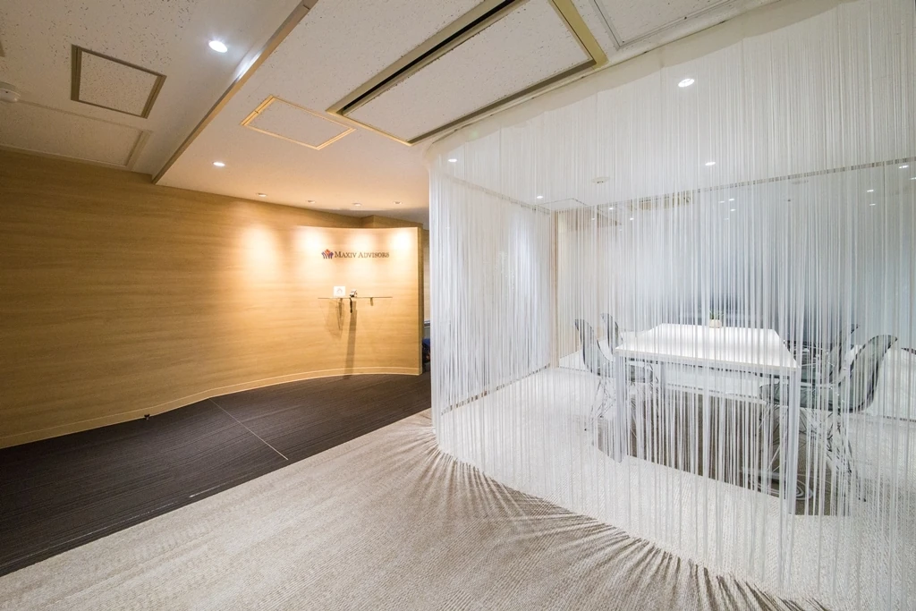 同じビル内でのご移転をお手伝いさせて頂きました。エントランスは曲線の木目壁を採用することで、訪れた方に、暖かい印象を与えるデザインです。また、エントランス内に打ち合わせスペースも設けました。ストリングスカーテン(細い糸の集まり)で空間を仕切り、ダウンライトで照明を当てることでカーテンから光が漏れ、陰影により、華やかさとやわらかいイメージをプラスしています。会議室には、開放感を与えるガラスを取り入れました。会計事務所のイメージに縛られず、訪れる方に安心感や信頼感を与え、リラックスできる空間を目指した、木目と光のオフィス設計デザインです。