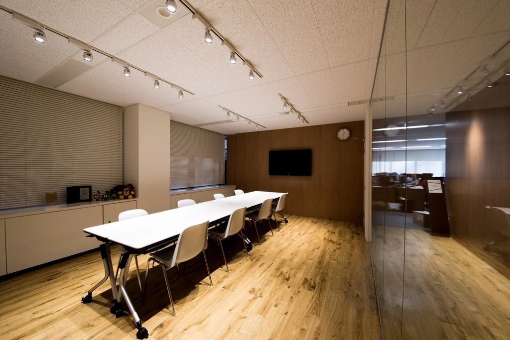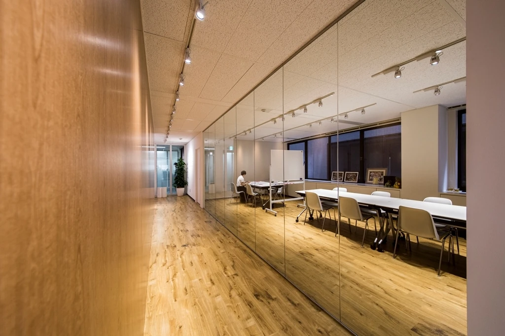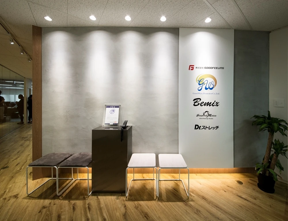 モルタルや木材・ガラスなどを多用し、素材感によるシンプルな空間構成を活かしたデザインにまとめました。一部にフェイクを使い、コストを考えながらバランス良く仕上げています。エントランス正面は、エレベーターホールから続くガラス貼りの会議室の壁を斜めにすることで、限られた空間の中で奥行き感を出しつつ、お客様を自然と中へと誘う工夫をしたオフィス設計です。廊下の奥には開放的なオフィス越しに外光が差し込み、空間の奥行き感を増しています。マテリアルの力を活かした新たな波(WAVE)を起こすオフィスデザインになりました。