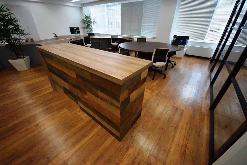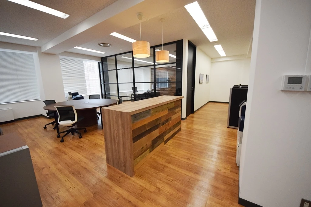 設計に当たりご要望頂いたのは「Clean&Crisp」。清潔でメリハリをつけて働けるオフィス、というテーマでした。毎日をきれいに過ごすために、オリジナルでデザインした造作家具を数多く導入。細かい備品の収納から、コートハンガー、テーブルや水回りまで含めて、統一されたデザインですっきりと見える様に工夫を施しました。リフレッシュ家具やバーカウンターもオリジナルで製作。バーカウンターには古材を使用し、ワークスペースの中央で存在感を放っています。フリーアドレスを導入したワークスペースは、広々としたデスクを特徴的なレイアウトで配置。お客様こだわりの絵画も計算された配置で随所に展示して、遊び心のある洗練されたオフィス空間が完成しました。