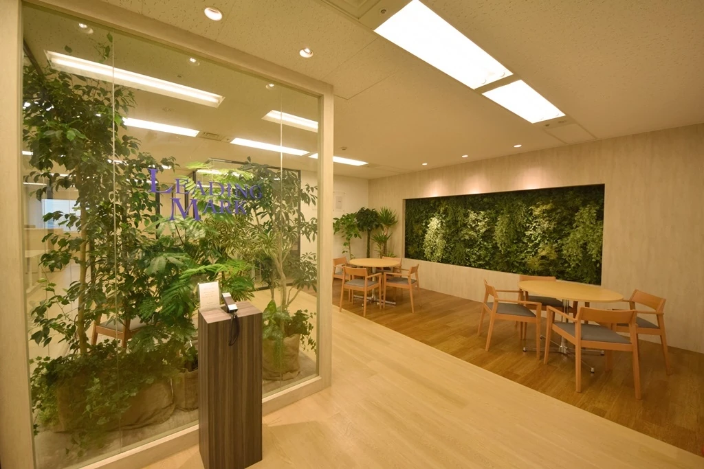 一歩入った瞬間に感じるのは「解放感」と「安らぎ」。ほとんどの部屋はガラスで仕切られており、エントランスからオフィス全体を見渡すことができます。木目と植物を多用しつつも、モダンでシャープなイメージを保つため、黒いフレームのパーテーションを採用。温かみの中にもクールさを感じる空間になりました。エントランス脇のオープンミーティングスペースにはグリーンウォールを設置。空間に優しさとインパクトを与えています。社員様専用のリフレッシュスペースには人口芝を敷き詰めました。ボタニカルなデザインで安らぎを忘れない、モダンでシャープなクリアオフィスが出来上がりました。
