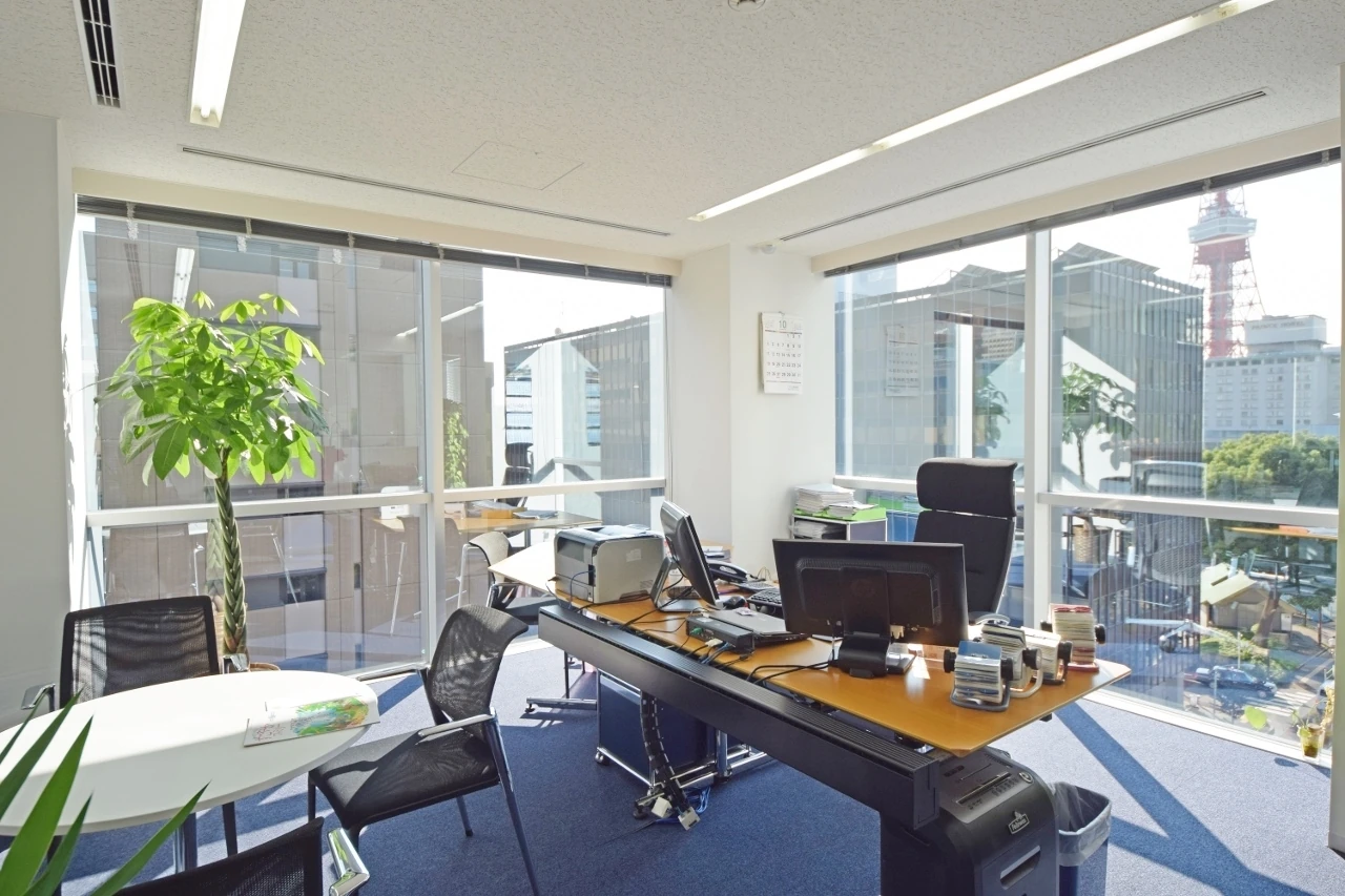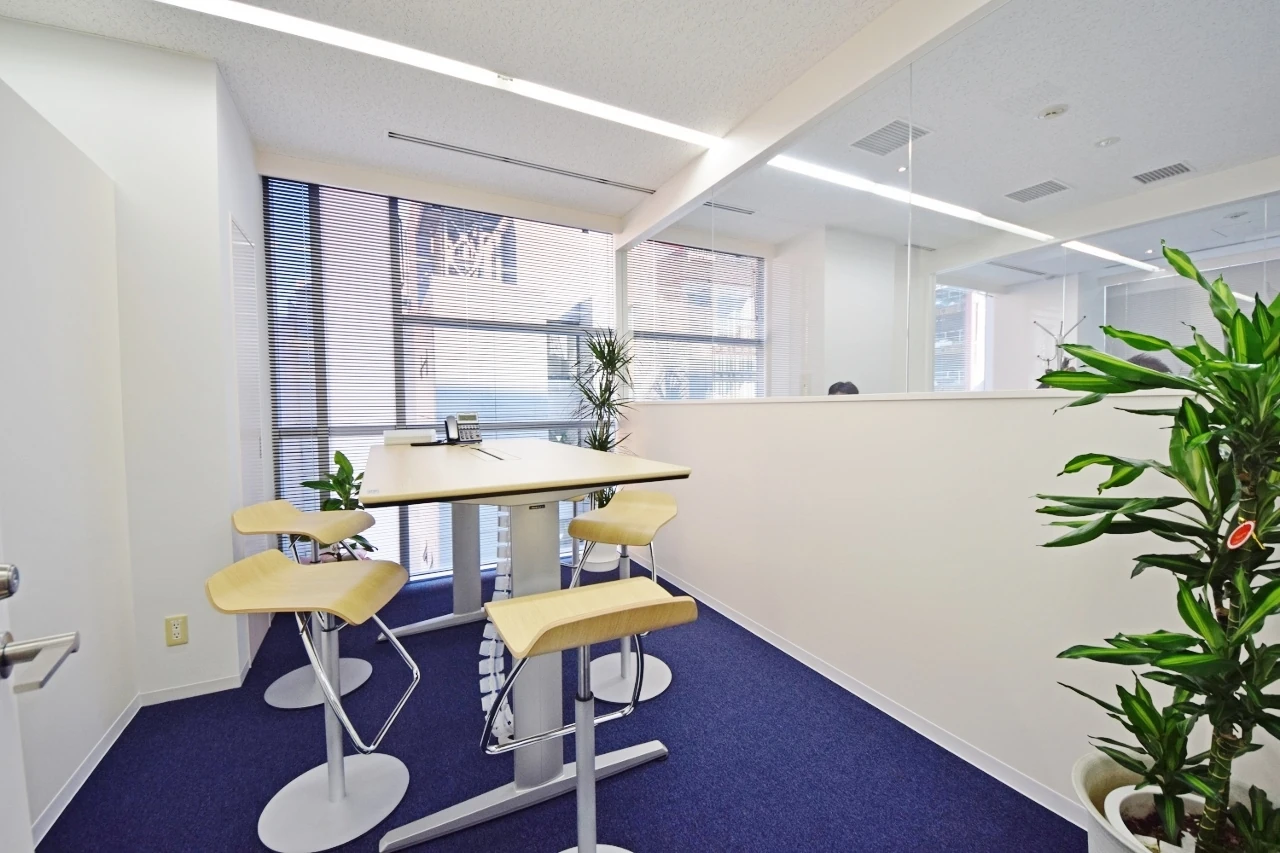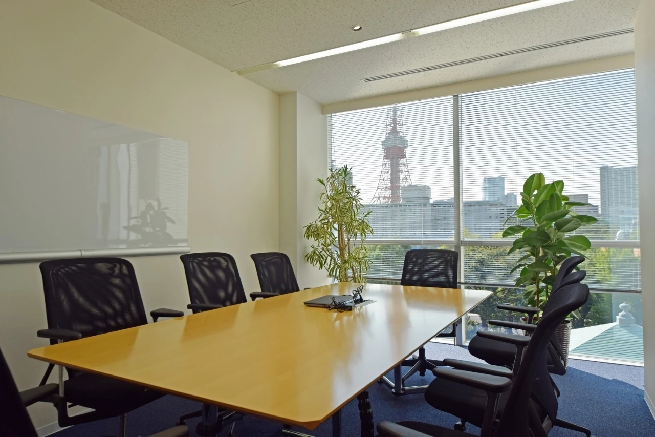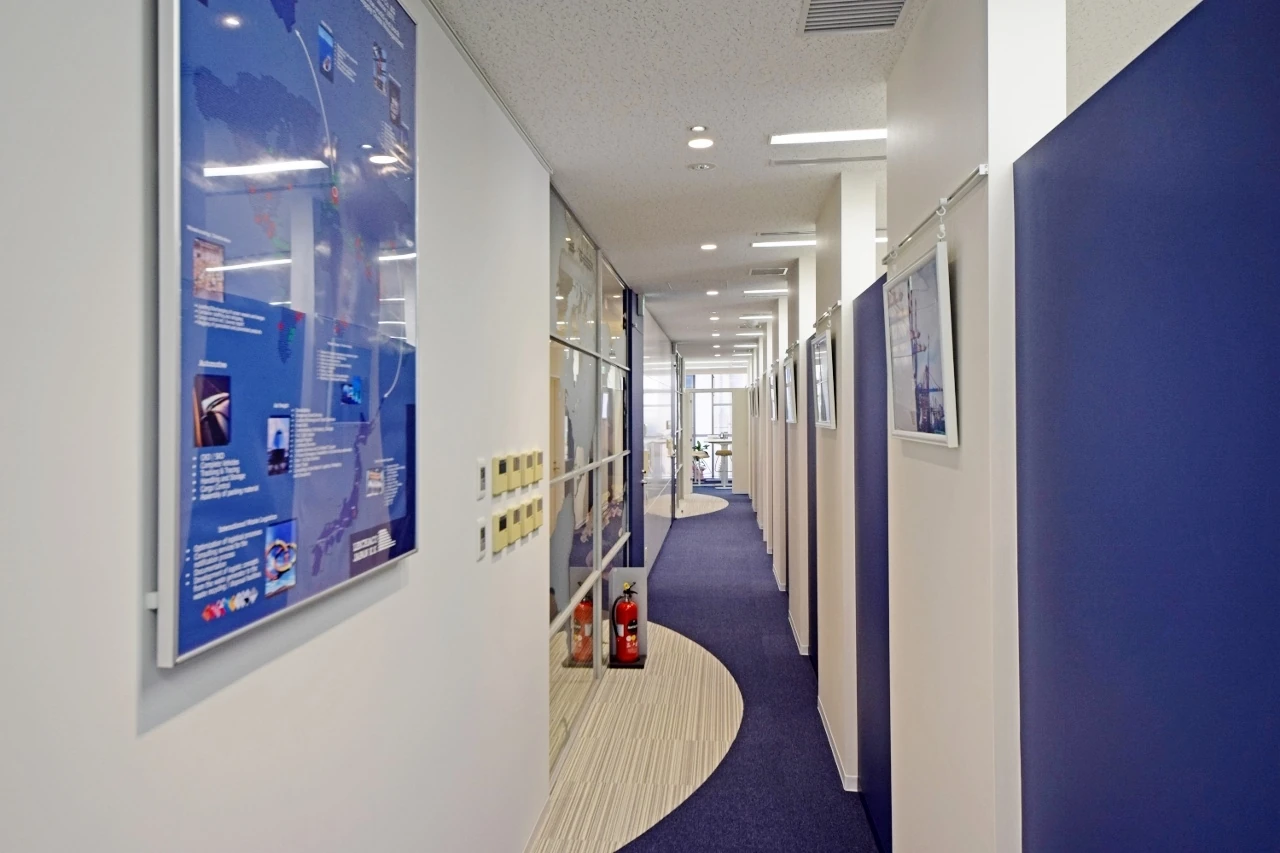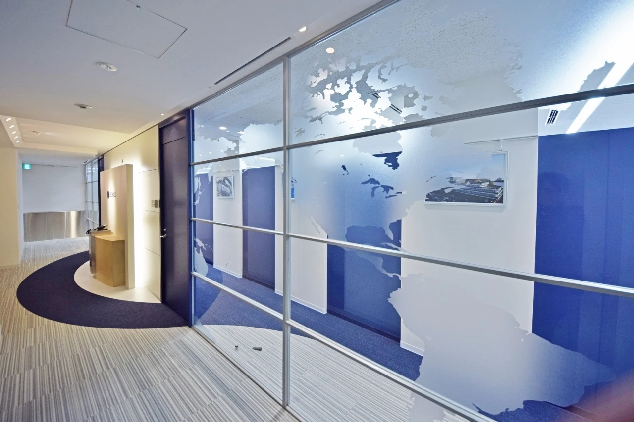 エレベーターを降りると、思わず背筋が伸びるダイナミックなエントランスが待ち構えます。共用部と専有部を仕切る既存のパーティションはレシャコブルーに色を変え、ガラスには世界地図を。間仕切りの向こう側まで続く床には、事業内容である「海運」をイメージした波の流線的なデザインが、躍動感をもたらす爽やかな空間に生まれ変わりました。会議室へ続く廊下の壁は、高さを段違いにして既存の照明を避けるとともに、荷受けカウンターを造作。機能面も十分に配慮しています。また、ワークスペースではガラス間仕切りを採用し、社員の皆様が東京タワーの眺望を共有できるレイアウトに。ビルが持つ魅力をさりげなく、かつ最大限に活かした、グローバルオフィスです。