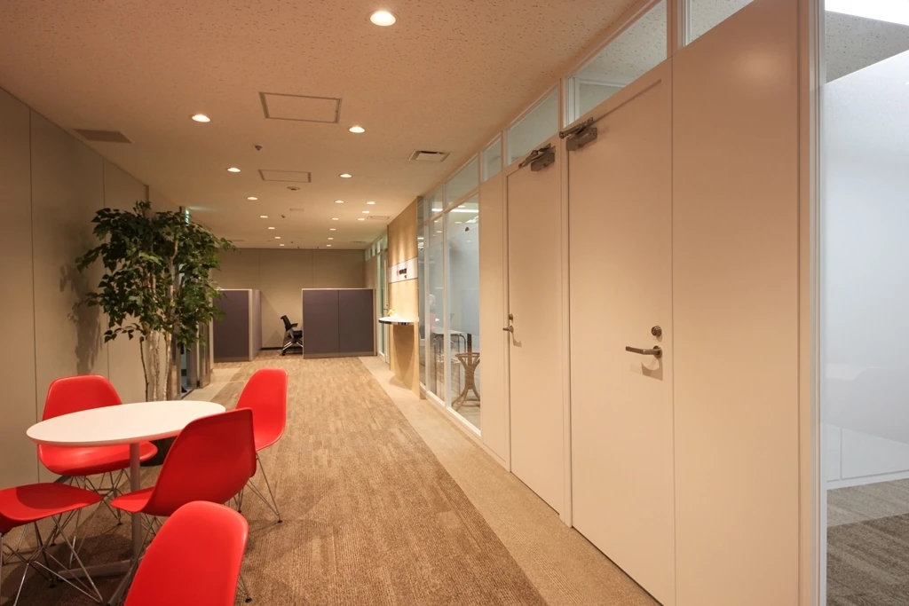 創業100周年を迎える歴史の中で培ってこられた「信頼」を表現しながら、明るく開放的で「未来」につながるオフィスデザインです。ロゴの赤と相性の良い明るい木目と白のシンプルな組み合わせをベースに、一面だけにグリーンのアクセントウォールを入れることで、安心感と親しみやすさも合わせ持つライトな空間になっています。また、暖かいイメージの温白色の光にすることで、落ち着いたやわらかい雰囲気と誠実さを演出した、優しく包み込むようなオフィスとなりました。