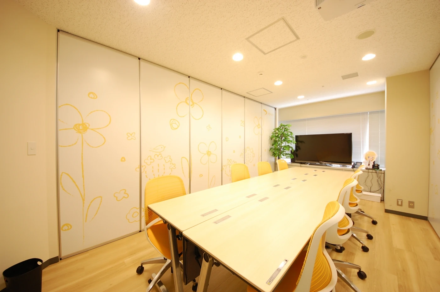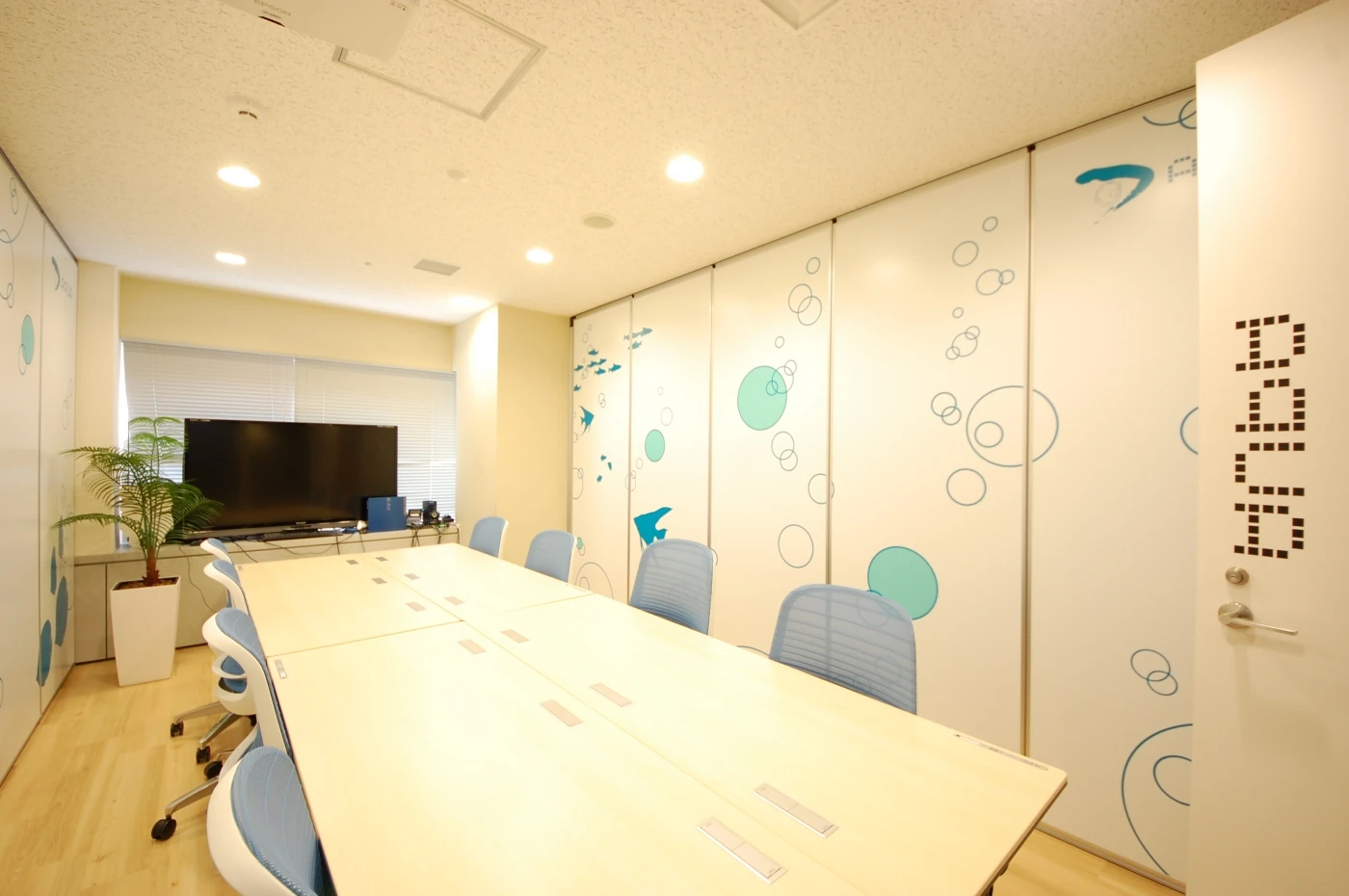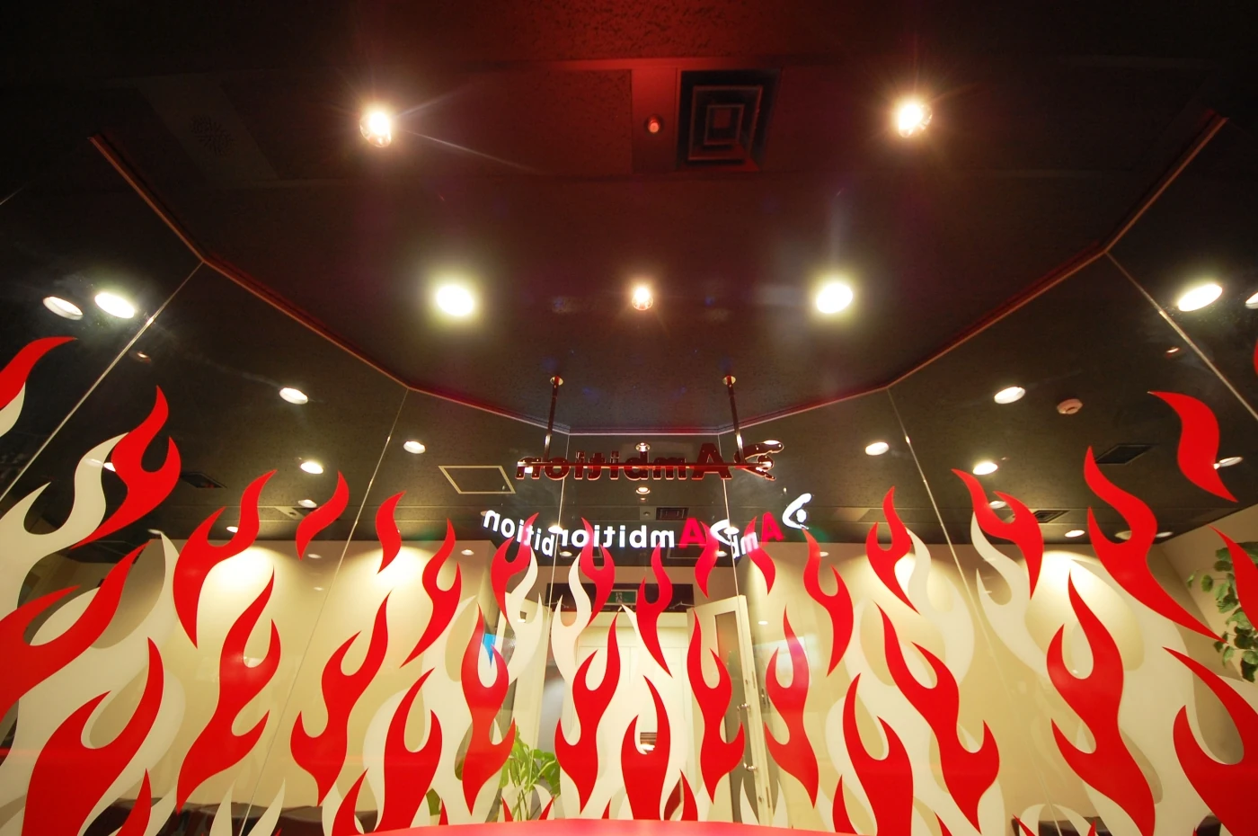 社名“アンビション”の和訳はタイトル“大いなる志”です。その言葉の意味を考えたとき、このエントランスデザインができました。メラメラ系のグラフィックは、ミラー加工したガラスの上にシートを重ねています。計3段階でのメラメラは、迫力ある演出となっています。七色に光るRGBライン(LED)やロゴは、ちょっと暗めにした空間にアクセントを与えます。会議室内はフレキシブルに対応できるように、移動間仕切りを採用しています。エントランスとの違いを持たせたいという想いから、癒しをテーマに『FLAME・AQUA・TREE・VENUS・EARTH』とネーミングを考えており、空間ごとに壁面のデザインを変えています。