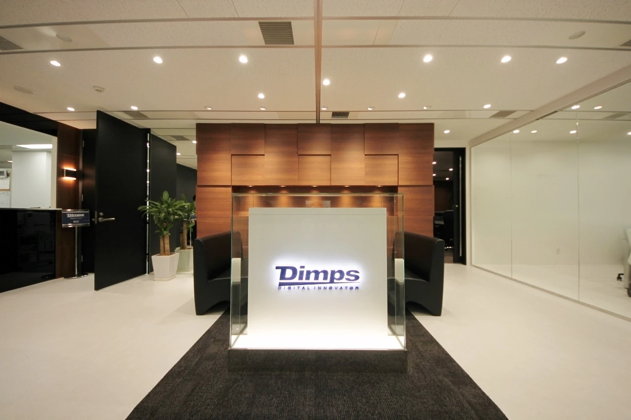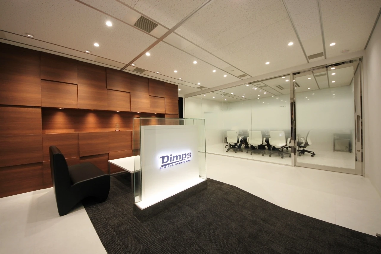 エントランスホールに足を踏み入れると、華やかながらも温かみのある雰囲気でお客様を迎え入れてくれる、そんな先進性を感じさせるラグジュアリオフィスを設計しました。ウッドパネル、ブラックのガラスや壁面では重厚感を表現し、ガラスのショーケースの斬新なサインは、新しいディンプス様のコーポレートイメージを表しています。ガラスやステンレス・木目などのさまざまな種類の素材をアクセントに用いつつ、全体を白と黒のベースカラーで配色することで空間にまとまりを持たせるデザインになっています。またエントランスに面する2つの会議室は、それぞれ『スタイリッシュな空間』と、『落ち着いた空間』の2つの雰囲気をつくり、どんな用途にも合わせられるようにしました。