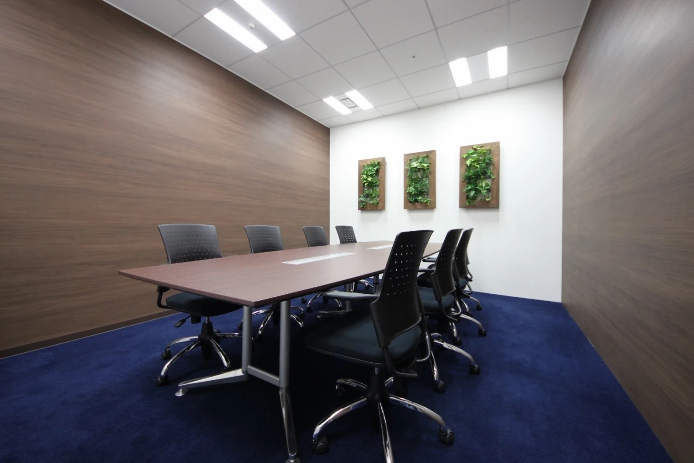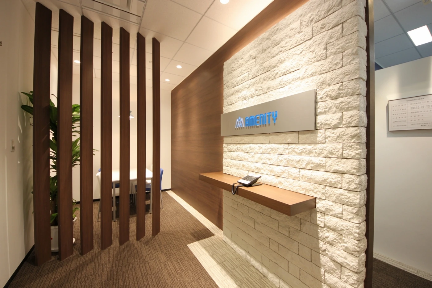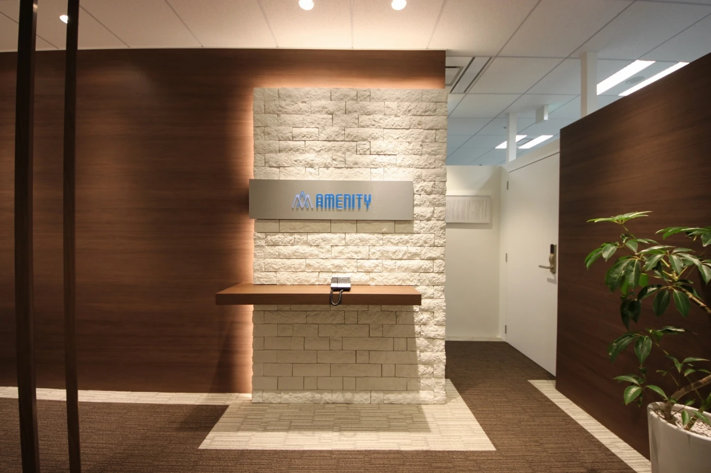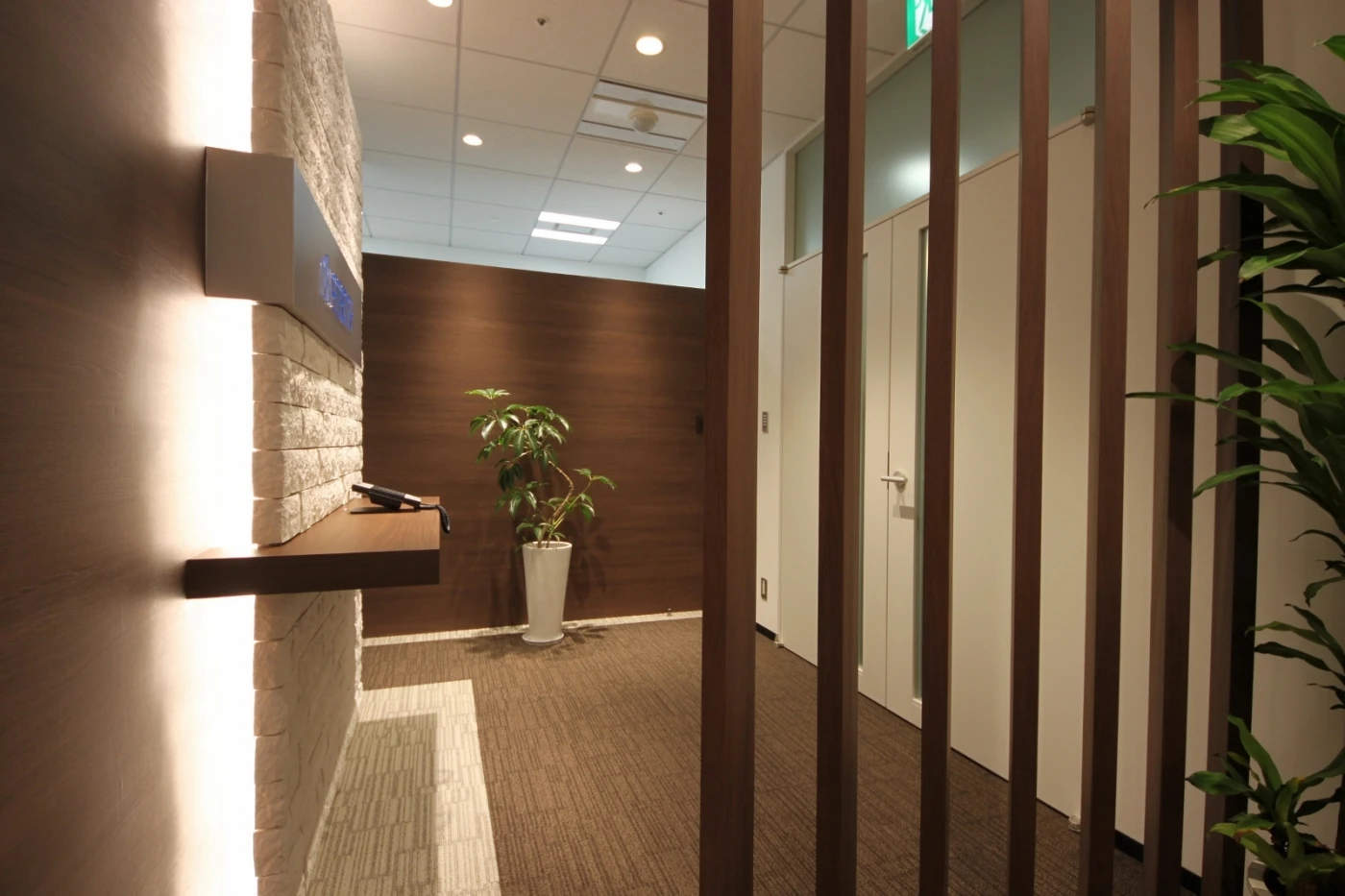 スタッフ増員に伴うご移転プロジェクトに携わらせていただきました。お客様が事業で掲げられている、快適・サポート・スムーズ・高付加価値のキーワードを受け取り、オフィス空間をデザインしました。エントランスは全体的に落ち着いた色合いで構成し、木目柄の表層材やブラウンのカーペットの中で、サインのついた石目タイルの壁面が来客者をやさしくお出迎えします。エントランスの左側にある打合せスペースは単純な壁ではなくルーバーで間仕切ることで空間に圧迫感を出さず、かつ連続性を損なわないようにしました。間接照明のL字ラインや床のカーペットのデザイン貼で空間に動きをつけ、見るたびにさまざまな表情をみせます。異素材の融合で織りなすエントランスが、新たなライフステージへいざなう、そんなオフィスが完成しました。