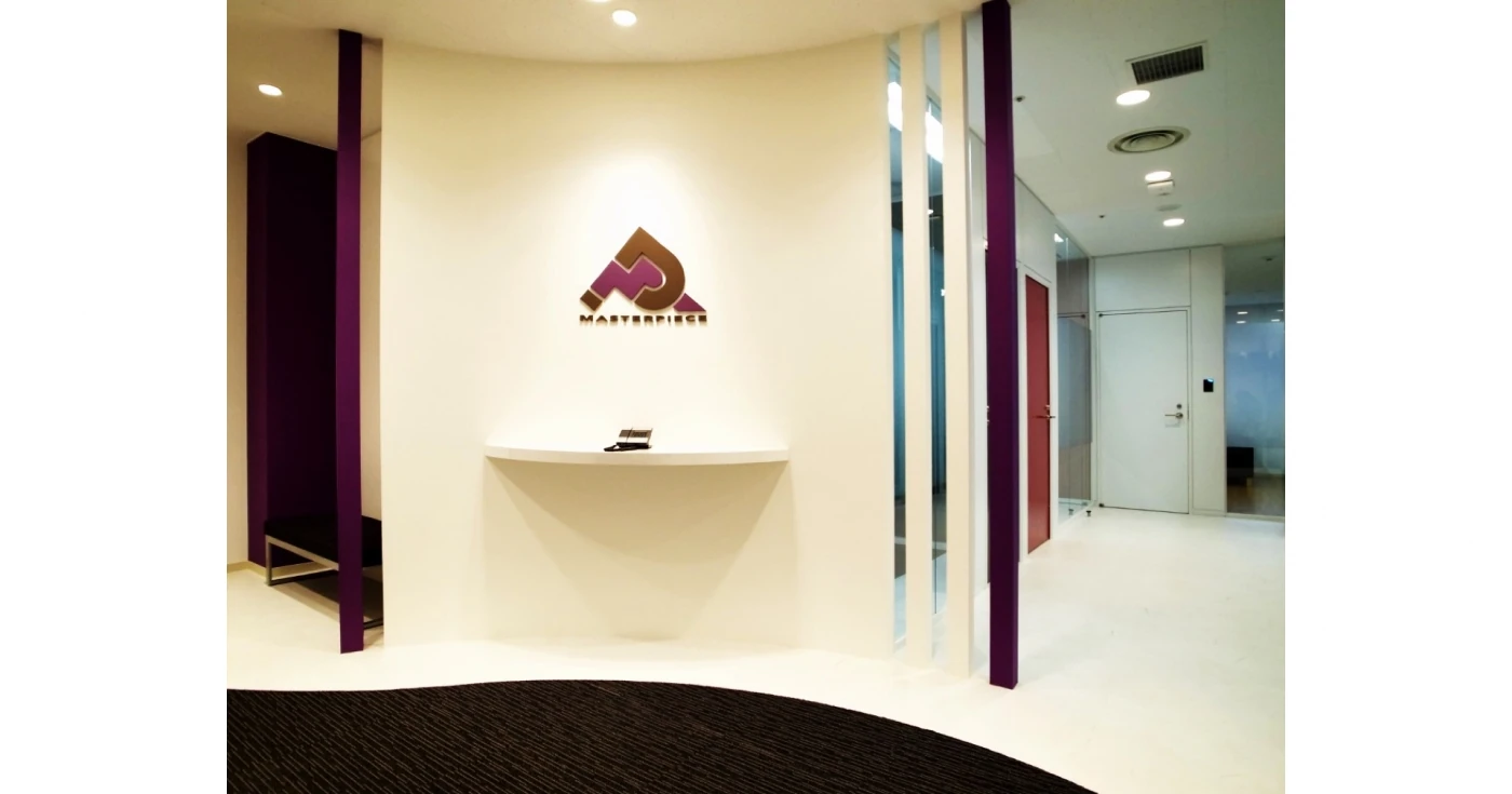 大幅な増床でのご移転であった今回のオフィスプロジェクト。エントランスもワークスペースも、非常にゆったりとした、贅沢な空間を設計することができました。広々としたエントランスには、壁面・カウンター・床面の模様など随所に曲線を施し、空間の広がりを感じさせ、動きを演出しています。また、白を基調としたシンプルでクリーンな空間に、コーポレートカラーの紫と大きなサインがポイントに。社名のマスターピース(傑作、名作)にちなんで、まるで名画が並ぶギャラリーの様な洗練された素敵なオフィス空間が完成しました。