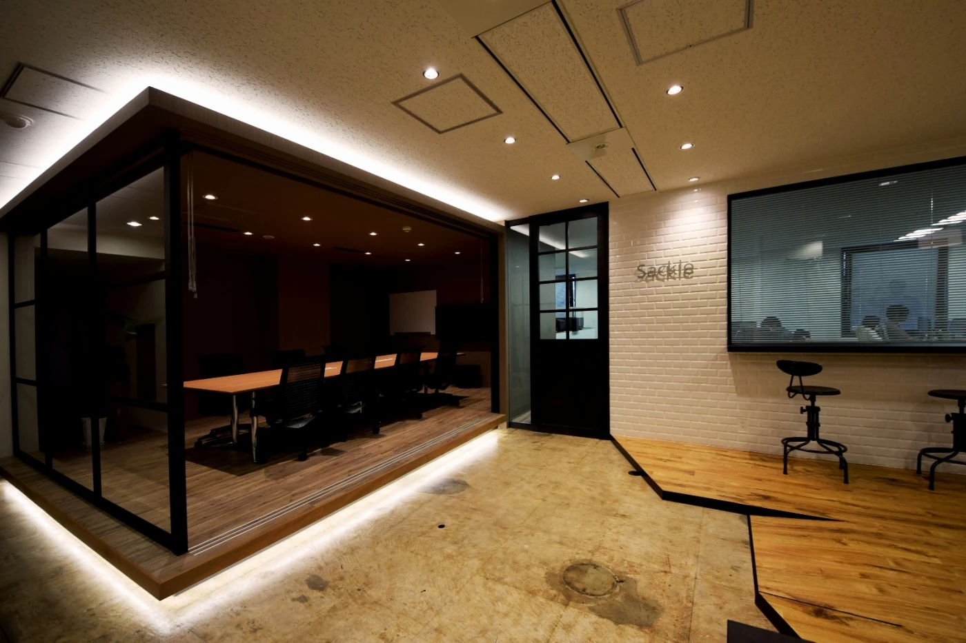 「studio for artisan」(職人のための工房) をコンセプトに、社員の皆様が楽しみながら仕事に取り組める空間を目指しました。コンクリート仕上げの床や壁面のタイル、黒フレームの間仕切りなどクールなイメージの素材と、明るく暖かいイメージの木目が融合し、居心地のよい空間に。オープンエリアは簡易的なミーティングからセミナーまで、用途に応じてフレキシブルに使えるように設計しました。また、各エリアによって床の高さ変えることでリズム感を生み出し、楽しみながらはたらくことができるオフィスをデザインしました。
