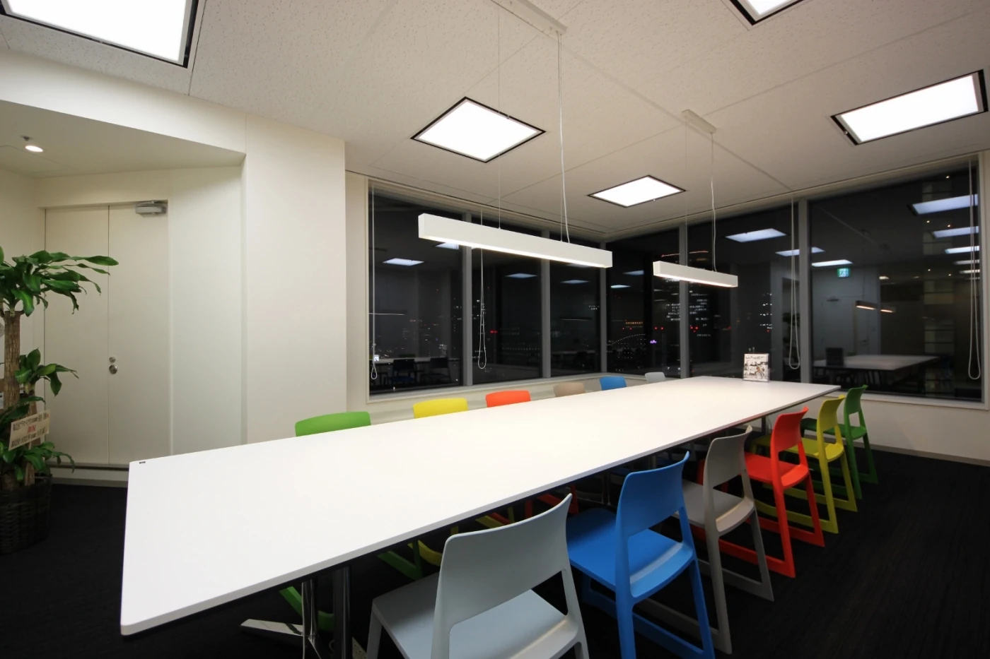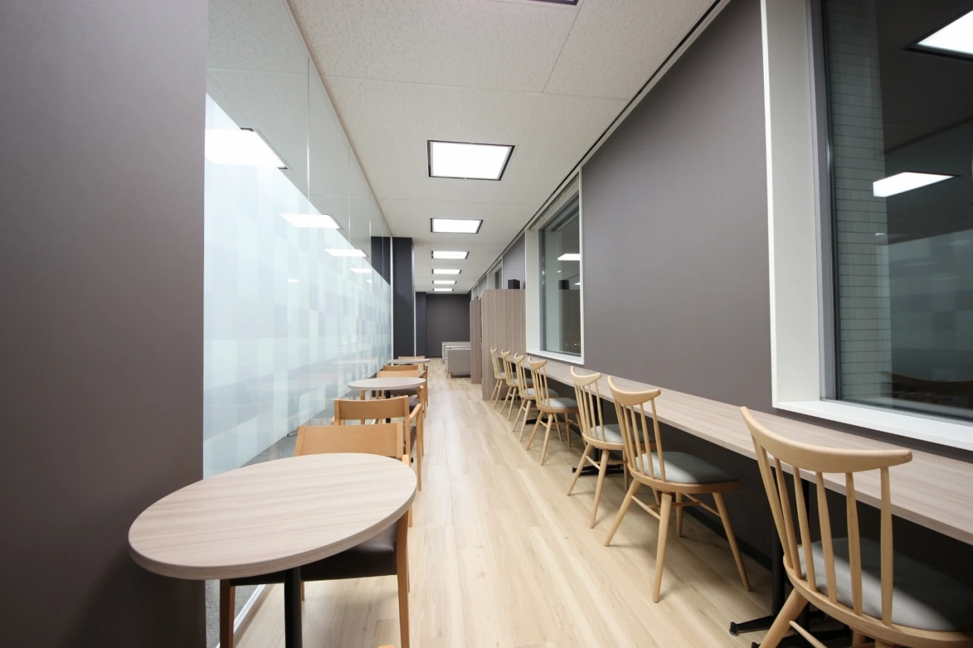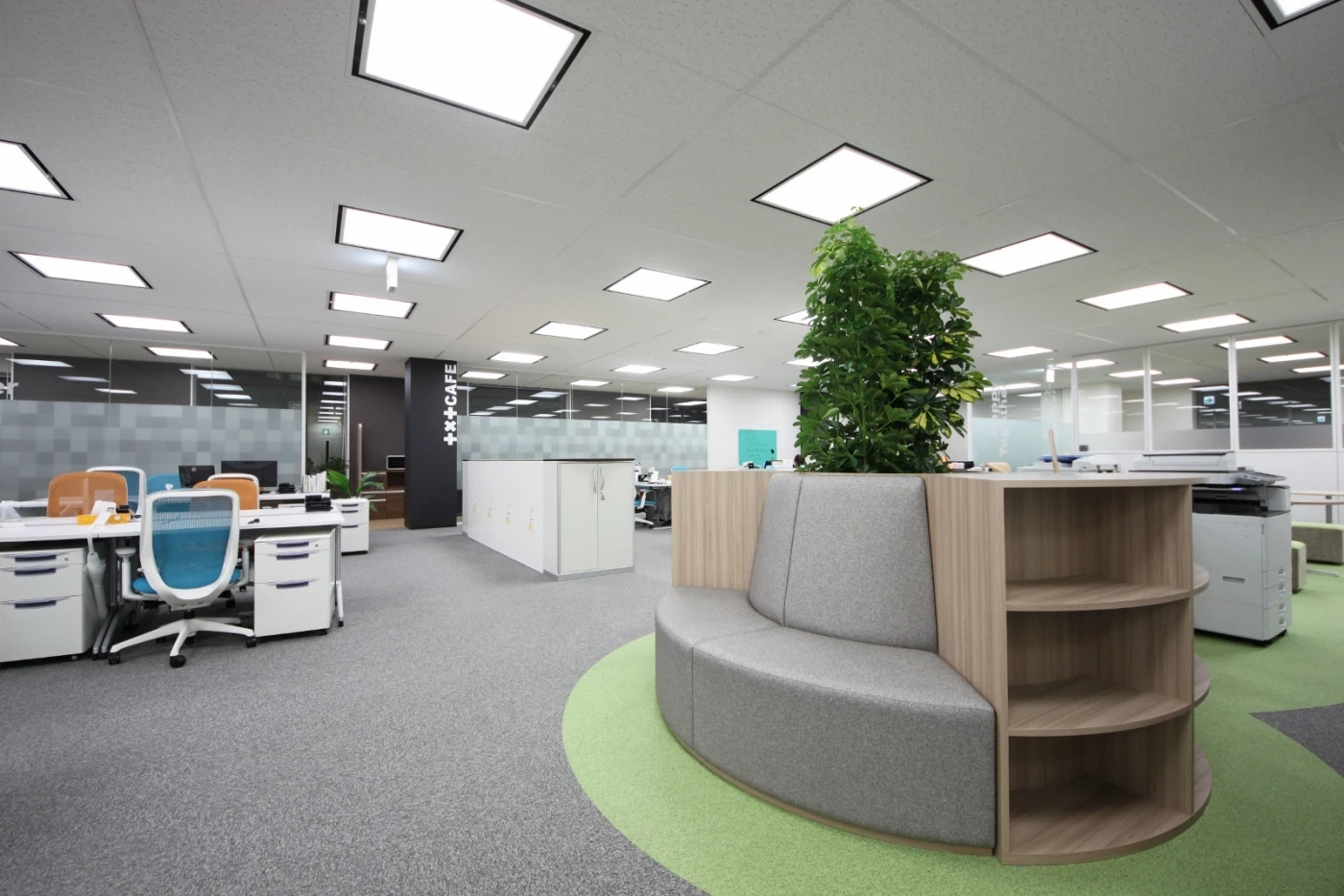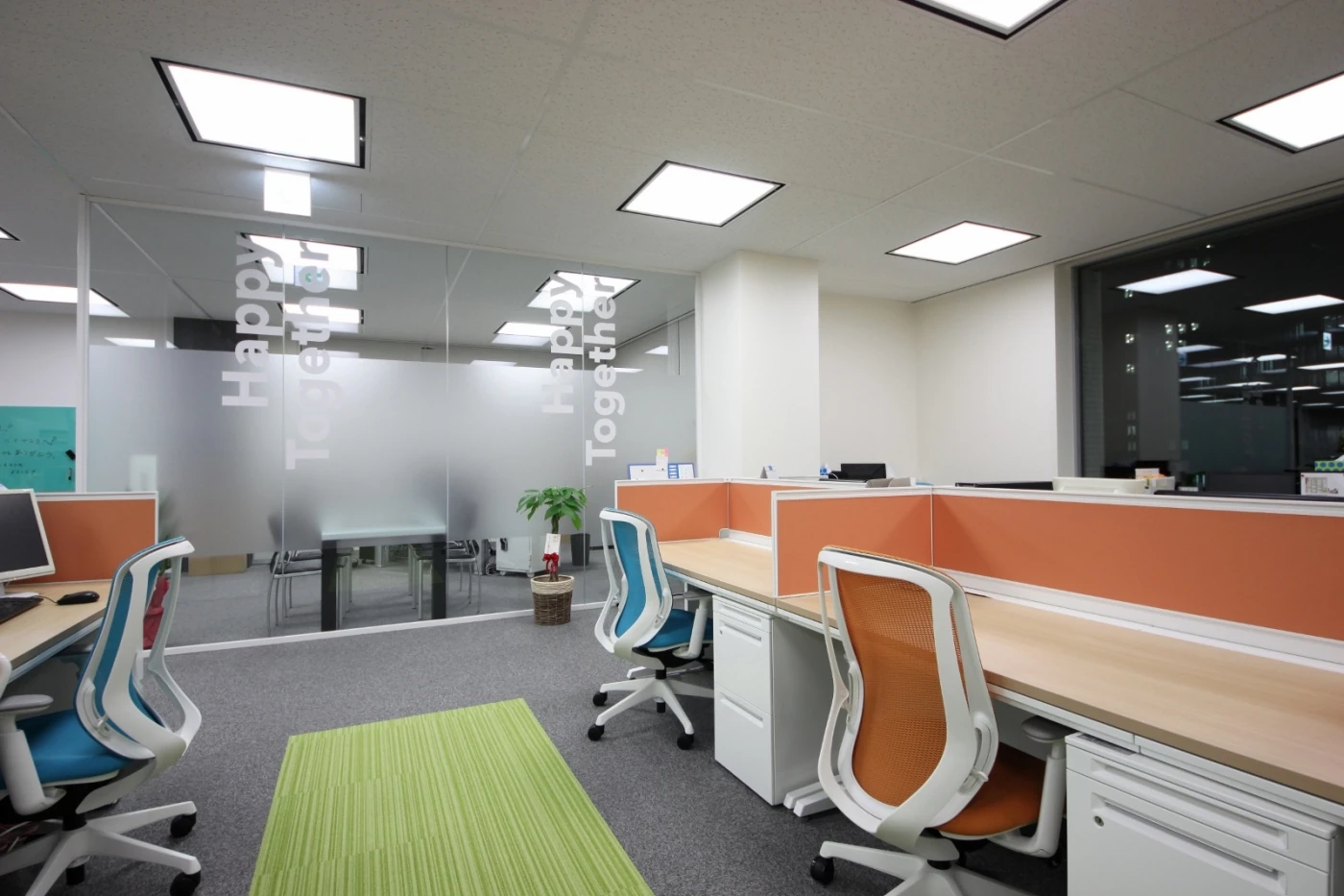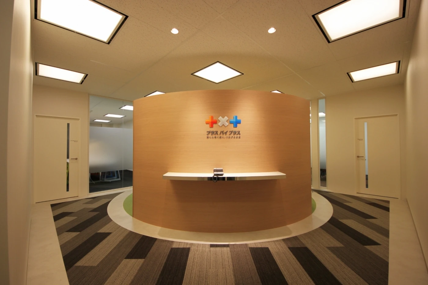 コンセプトは「+α」。企業理念の一つとしてプラスの連鎖が生まれやすい空間となるよう、「明るく開放的」「わくわく」「あたたかみ」「新しさ」をキーワードにオフィスの全てのエリアに+αのエッセンスを取り入れました。エントランスは、顧客によりそう温かみや親しみの印象、ソフト業界の新しいフレッシュな印象をイメージできる空間としました。音漏れを防ぐガラスの壁と床にグリーンを取り入れた集中できるテレアポスペース、またプラスバイプラス様のコーポレートカラーを全てに取り入れ、さらなるプラスの連鎖が生まれるオフィスとなりました。