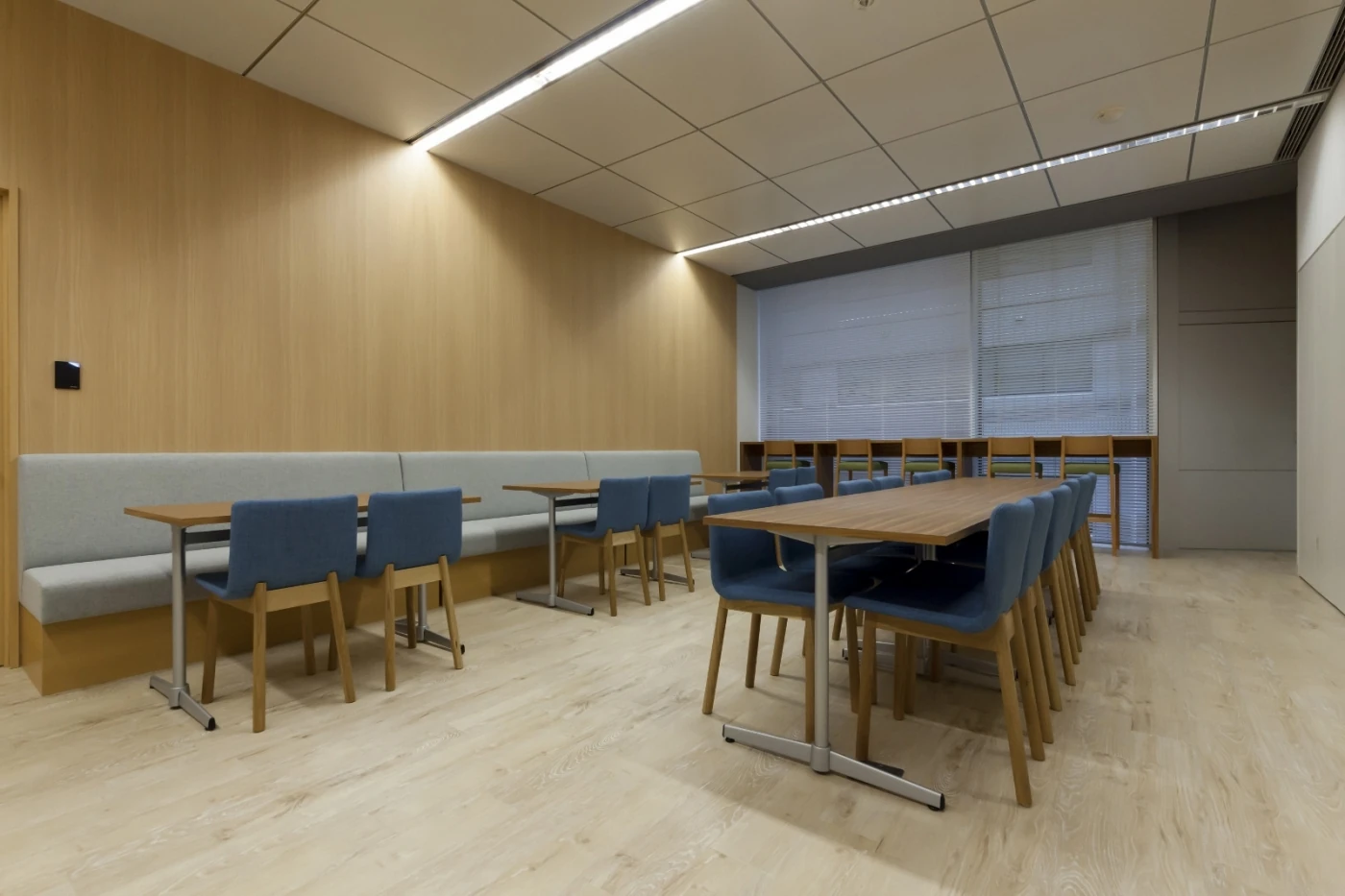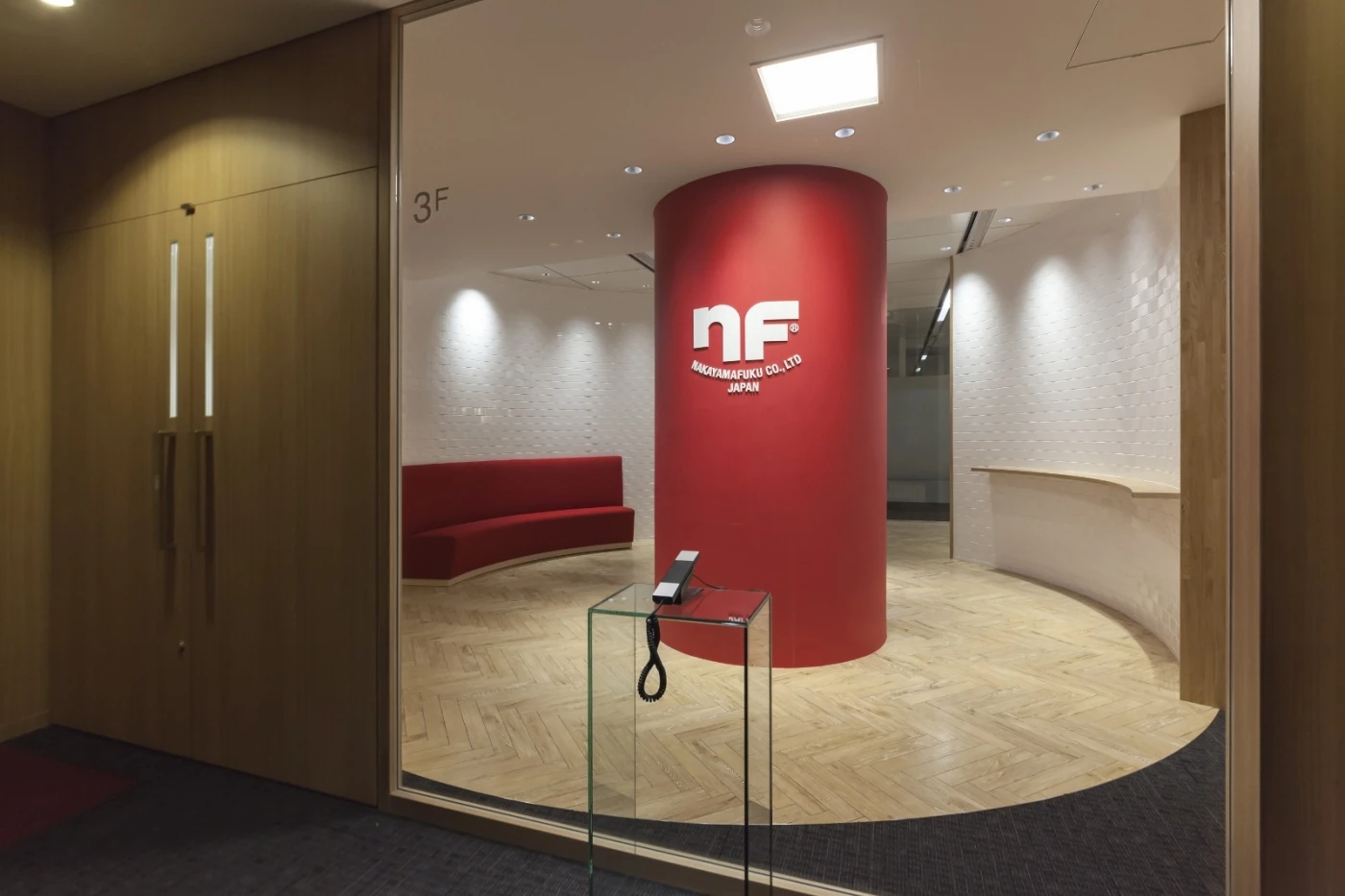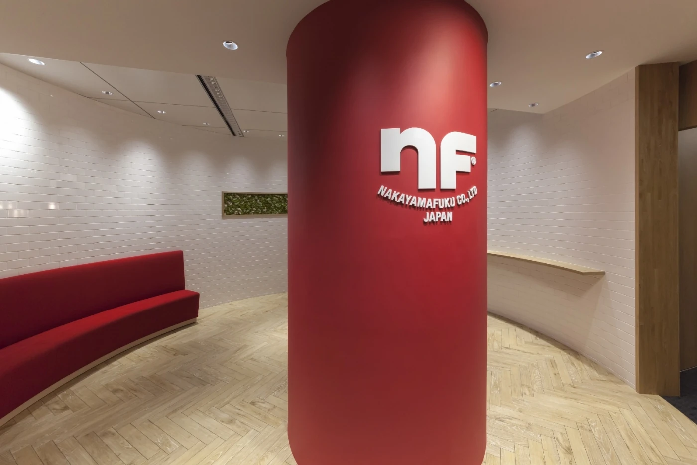 本社機能の一部を大阪から東京へ移し、2本社制をとられるというタイミングでプロジェクトに携わらせていただきました。エレベーターを降りると、コーポレートカラーの柱が際立つエントランスとお家を思い浮かべるような優しく明るい空間が出迎えてくれます。壁面は、家庭のキッチンを思わせるような白いタイル張りになっており、取扱商品を展示するショールームへと繋がっていきます。会議室は世界各国の「ありがとう」の言葉を名付けました。リフレッシュルームは目線高や座り心地の違うチェアを入れ、お客様ともお話できるような明るい雰囲気の空間を作りました。