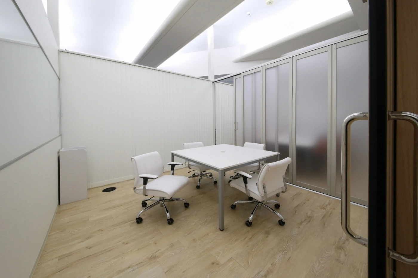 今回が2度目のオフィス移転で、前回のデザインを踏襲しつつ、さらに洗練しスケールアップした空間をというご要望をいただきました。エントランス正面のタイルは、実際にショールームに足を運び選んだこだわりのタイル。上部に照明を設置し陰影がつくことで、タイルの質感とサインの輝きがより強調されるよう工夫しました。会議室は可動間仕切で仕切り、用途に応じて個別や大きな空間に変更できる造りになっています。他にもブラケットライトやガラスのホワイトボード等、随所にこだわりが詰まっています。天井の高さを活かした、光がたくさん入る気持ちの良い空間になり、誠実で爽やかな印象のアイグローブ様らしいオフィスになりました。