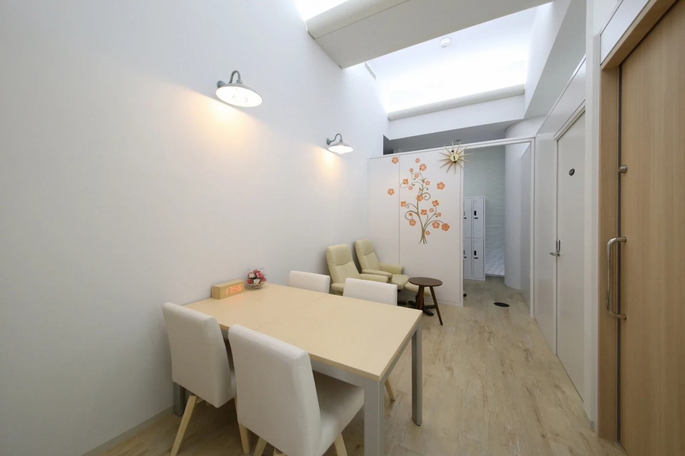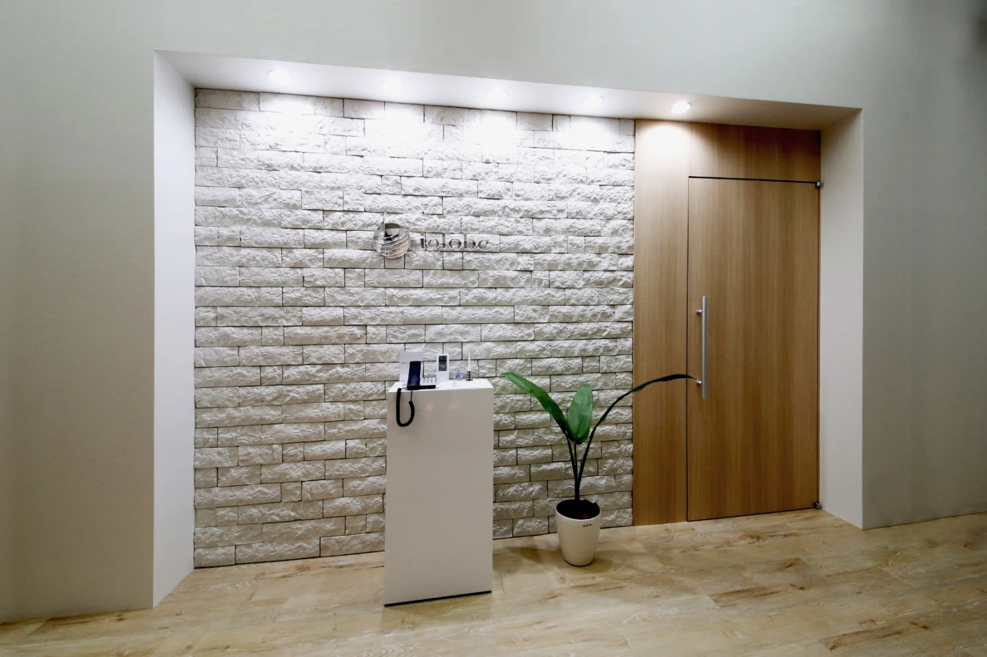 異素材のコラボレーション。タイル×木目×クリスタルがマッチした爽やかオフィス