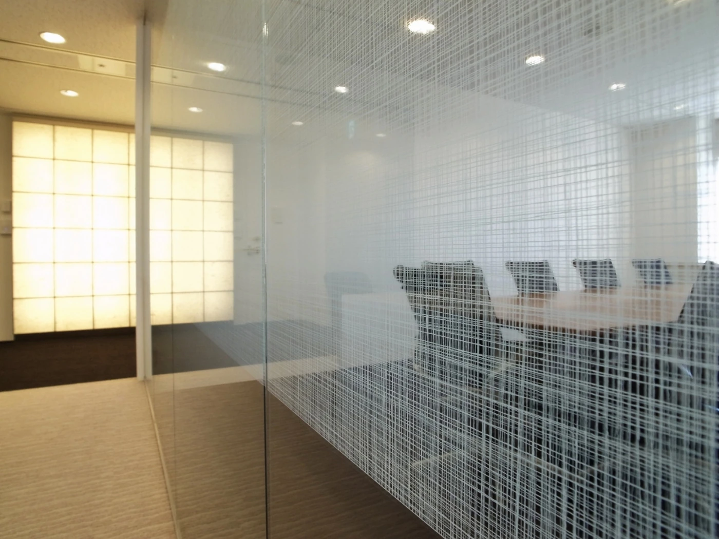 「新しいもの」と「古き良きもの」を組み合わせたオフィスにいたしました。エントランスはステンレスで格子を組み、和紙を挟んだガラスを用い、異なる素材を掛け合わせたデザインを採り入れました。和紙の壁面から煌々と放つ間接照明がエントランス全体を明るく照らしています。ガラス壁の会議室に使用した目隠しフィルムにも和柄を用い、エントランスとの統一感を図りました。