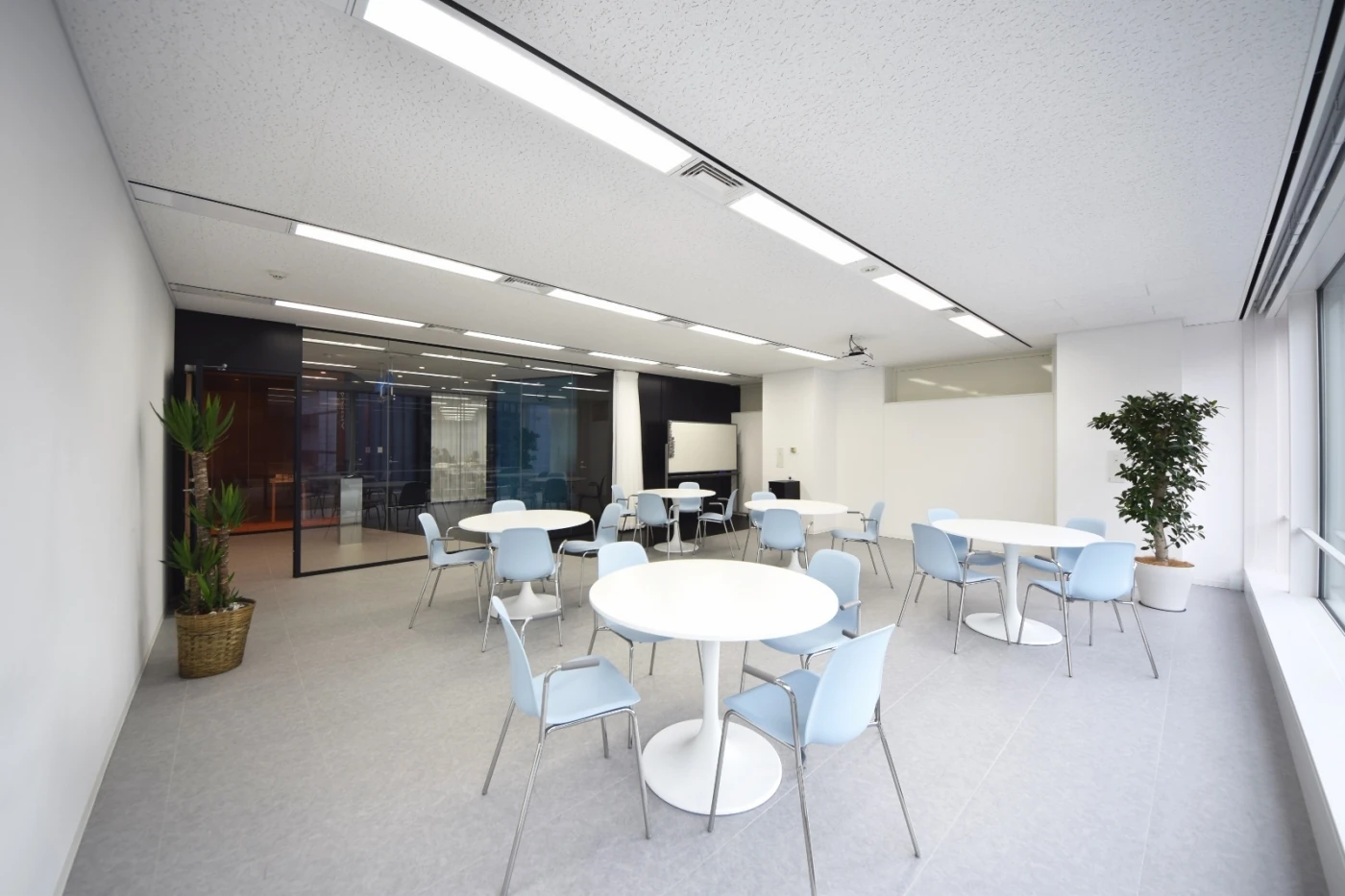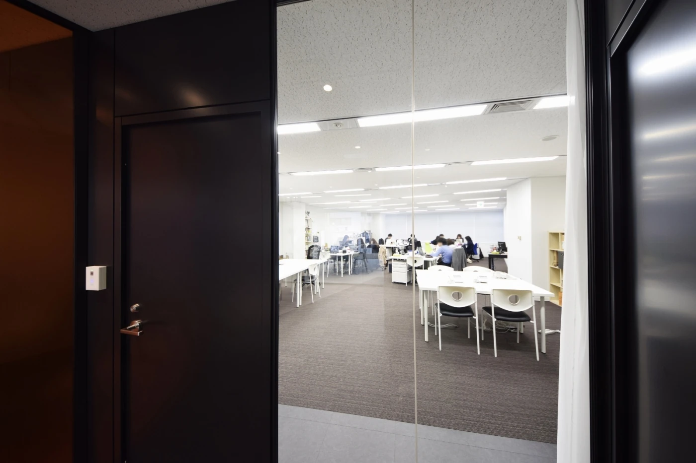 床はエントランスから隣のセミナールームへと繋がるデザインとし、より奥行感を感じる広々とした空間を演出します。ワークスペースとの間仕切りにもガラスを用いることで企業の透明性を表現し、安心感に繋がるデザインとしました。状況に合わせてレースカーテンを敷くことで、空間を適度に間仕切ることもできるようにしました。