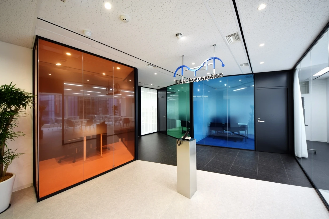 カラーでインパクト、ガラスで開放感を。人と社会を繋ぐオフィス
