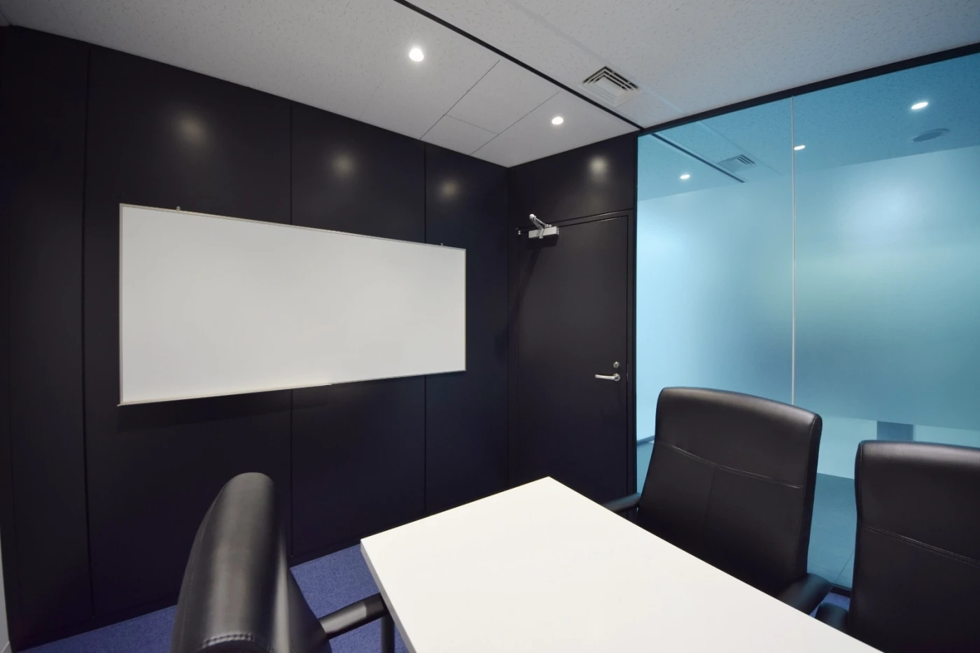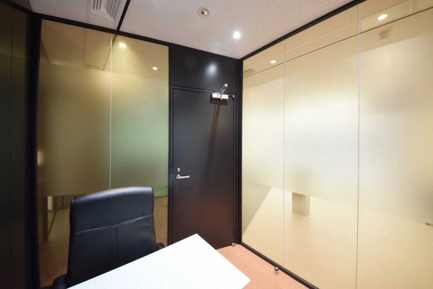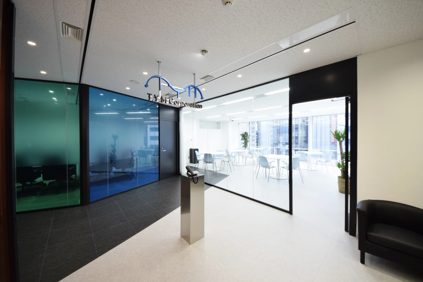 「開放感」と「透明性」、「個性」をキーワードに、エントランスは開放感を演出するため壁は設けず、サインは天井から吊るすデザインとしました。エレベーターから降りるとすぐに現れるエントランスの向こうには、個性的にレイアウトされたカラーシートを施した会議室が目に飛び込みます、訪れた方にインパクトを与え、印象に残るエントランスを目指しました。