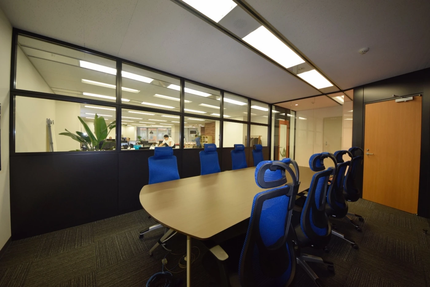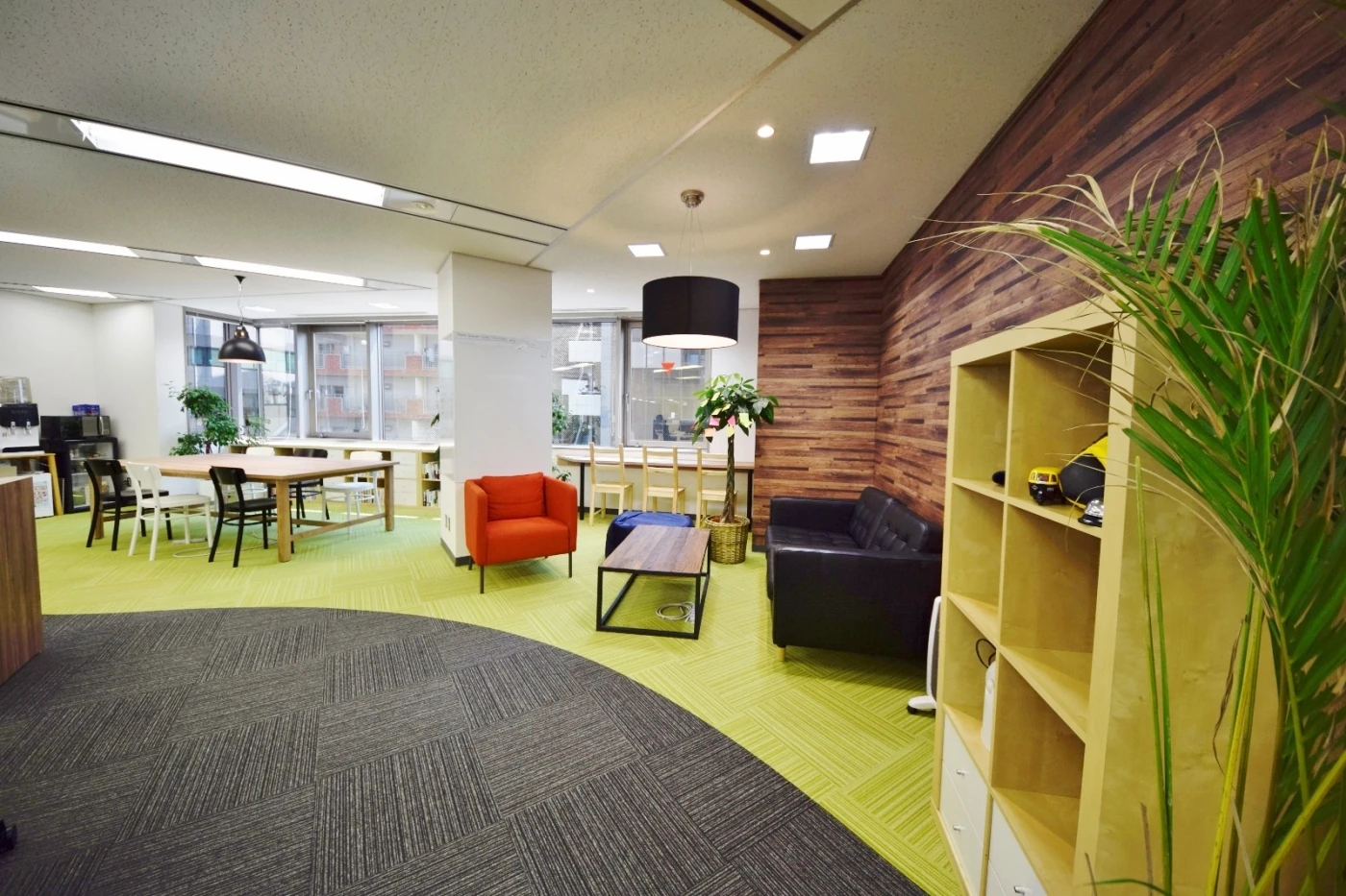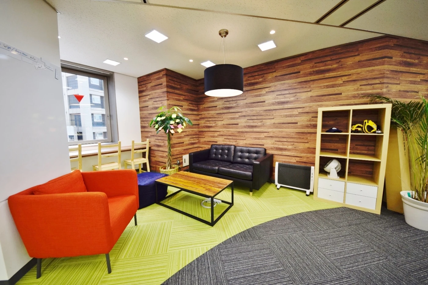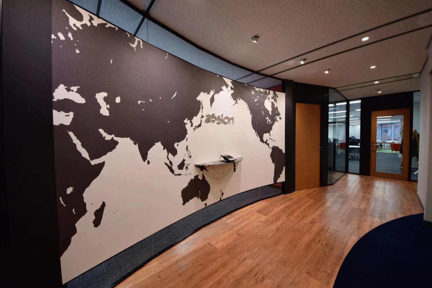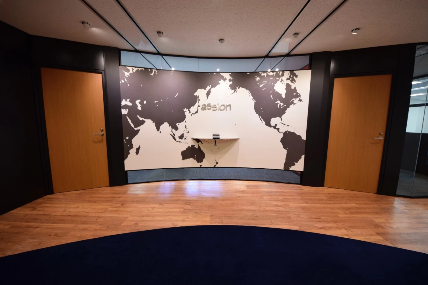 エントランスに入ってすぐ見える、アールの壁一面に世界地図のグラフィックを貼り、お客様にアッション様の躍動感を感じていただけるデザインを施しました。エントランスホールの雰囲気は、木目の床に、黒のパーティションを取り入れ、温かみを感じさせながらも引き締まっている空間を演出しました。ワークスペースの雰囲気もエントランスのガラスの隙間から見ることが出来、面接に来られる方々に誠実なイメージを感じて頂けるデザインになりました。リフレッシュスペースで働かれる方や、立ちミーティングをされている方々など、様々なシーンが見受けられる、機能性も兼ね備えたオフィスです。