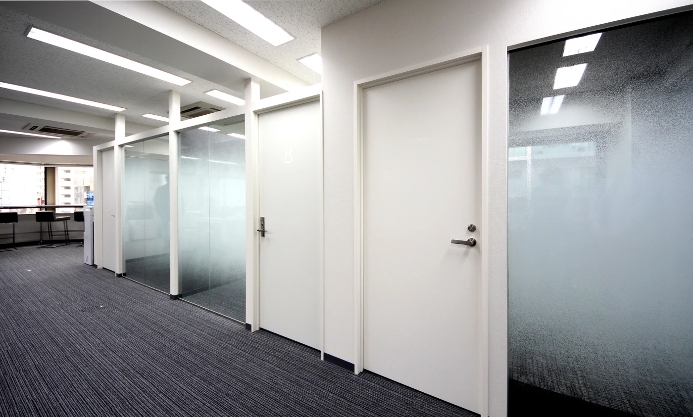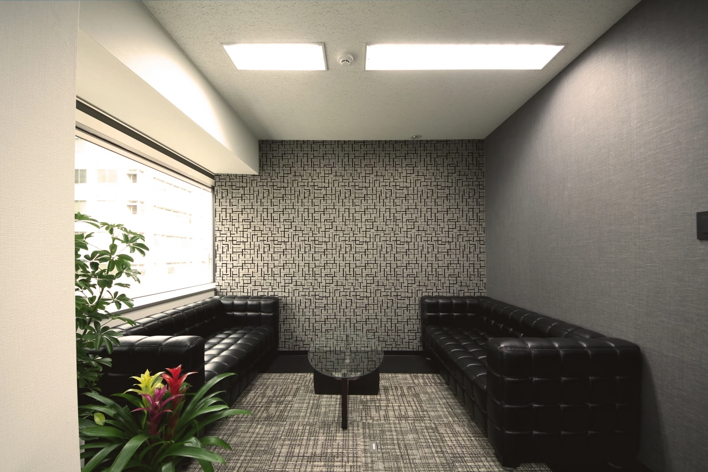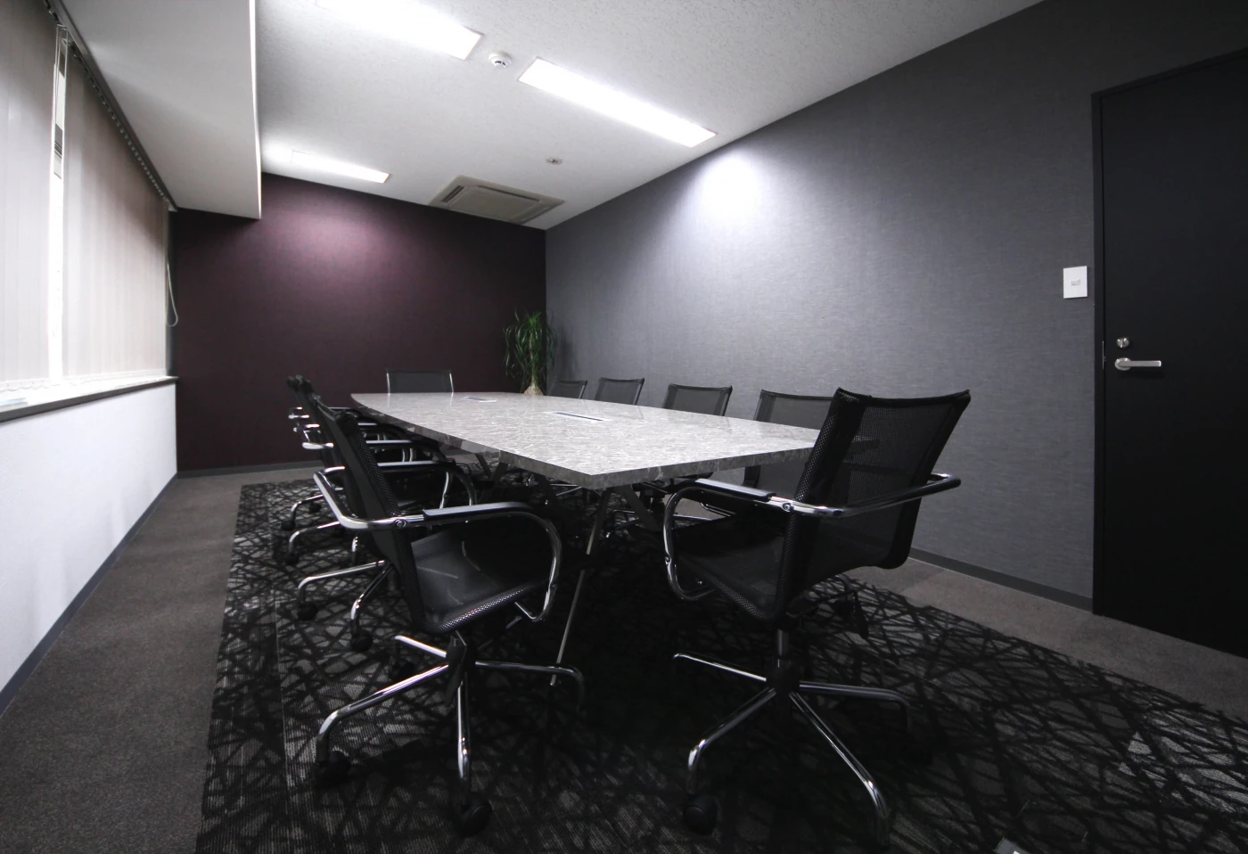 また会議室や社長室は、品性と個性をテーマに演出。壁面の基調色としてマットグレーの織物素材を採用し全体的に品性をもたらしつつ、壁面の一面にまったく違うトーンの幾何学模様をデザインし個性を表出。コンパクトな空間に品性と個性が演出された会議室デザインとなりました。