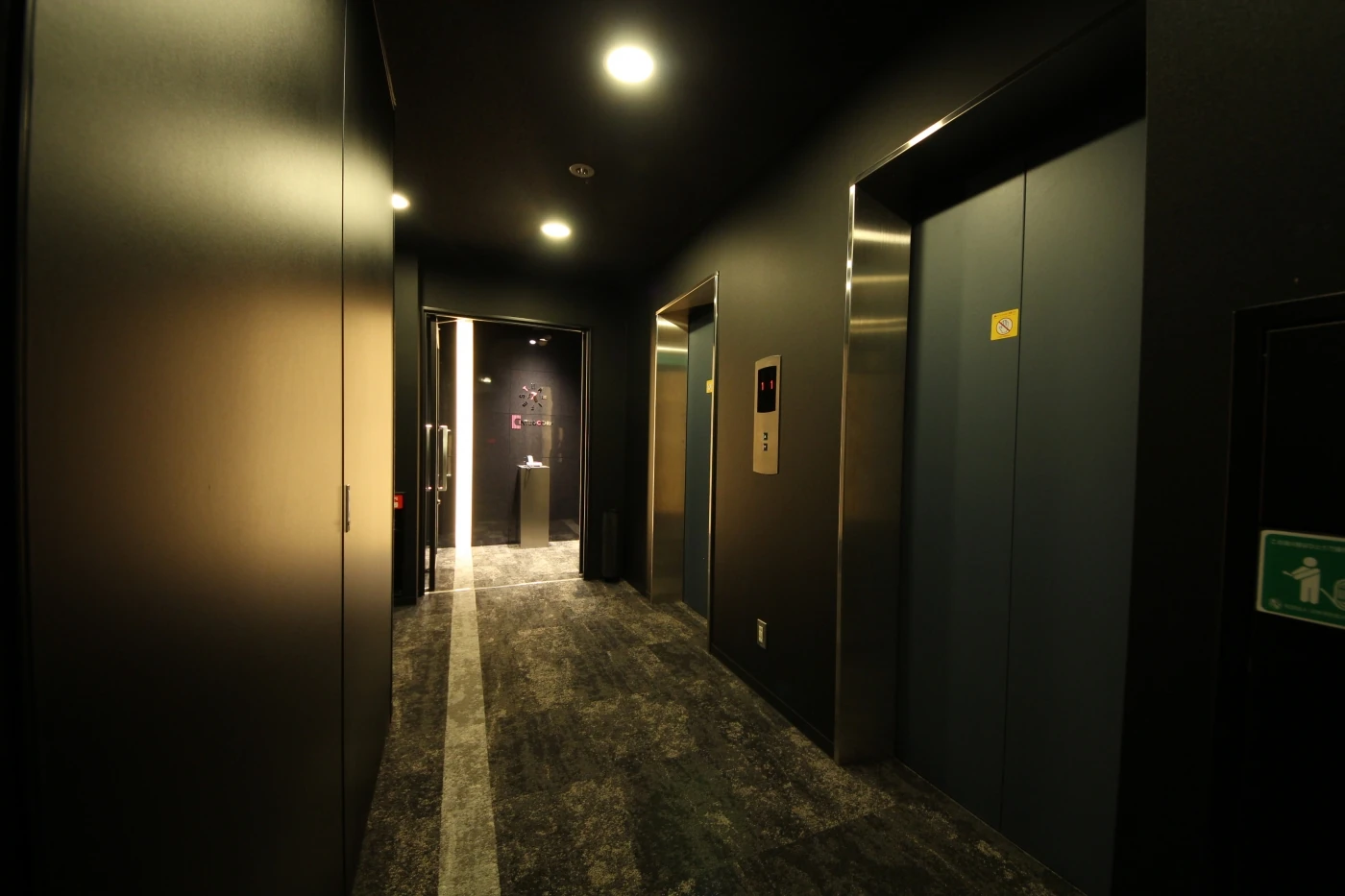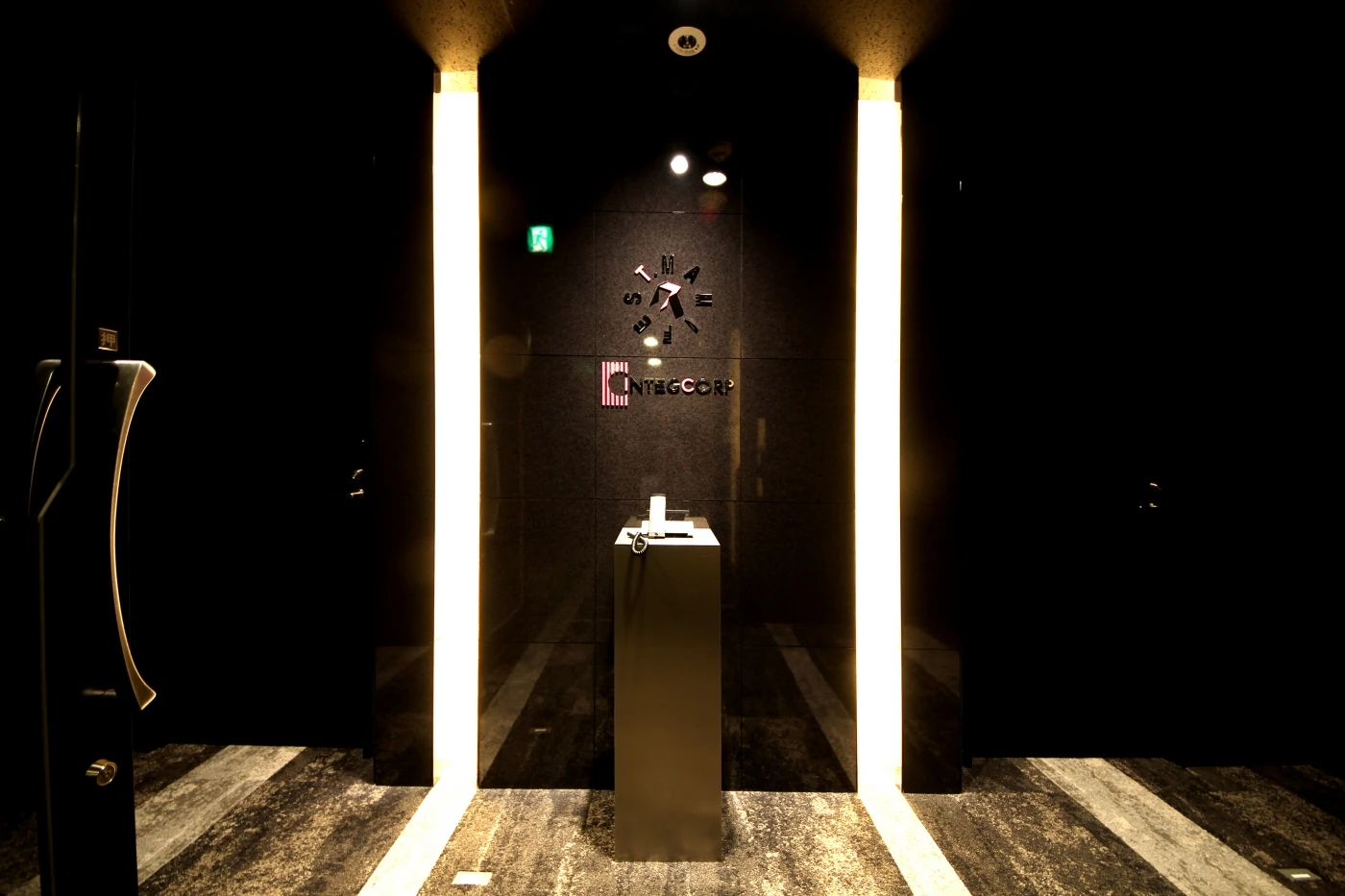エレベーターホールとエントランスのデザインにつながりを持たせ、フロアに降り立った瞬間からエントランスまで黒で包まれた独特の空間がひろがります。来訪者の方に衝撃を体感してもらえるようデザインしました。