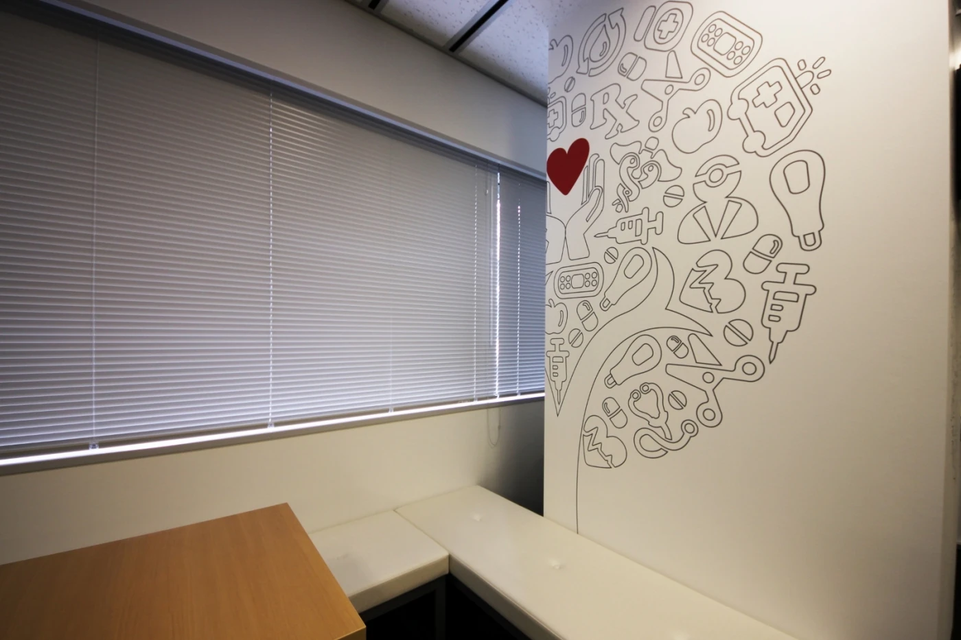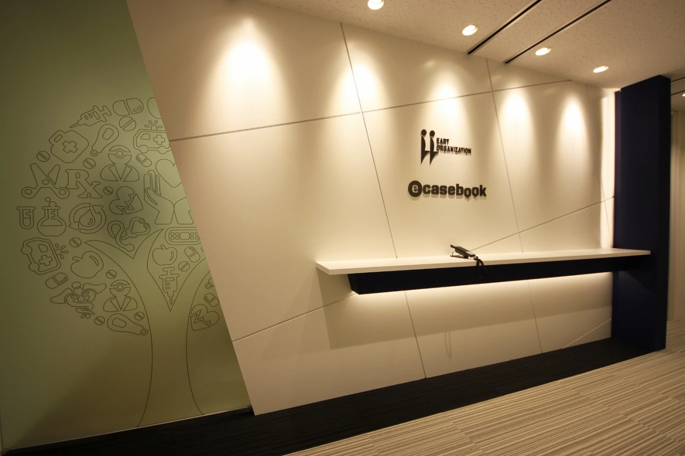 ITを活用して専門医同士のコミュニティを円滑にし医療技術の発展を促す事業を行うハート・オーガナイゼーション様は、IT系技術者を確保・採用することを目的に移転することとなりました。エントランスは知的さを感じさせるクールなデザインですが、会議室間のガラスはモチーフのイラストを施すことで、アットホーム感をプラスしました。会議室は木目とブルーを用いて集中を促し、壁面のロゴで企業ブランドをアピールします。ワークスペースには、オープンミーティングスペースと多数のホワイトボードを設け、誰もがいつでも話し合いができる雰囲気を目指しました。家具は黒と白でまとめ、中央にはモチーフのイラストをアクセントに。リフレッシュスペースは窓際にベンチを配置し、多人数にも対応できるみんなの憩い場となりました。どの場所からもみんなの心をつなぐモチーフのイラストを見ることができ、新しい仲間が増えても結束力が日々高まるオフィスとなりました。