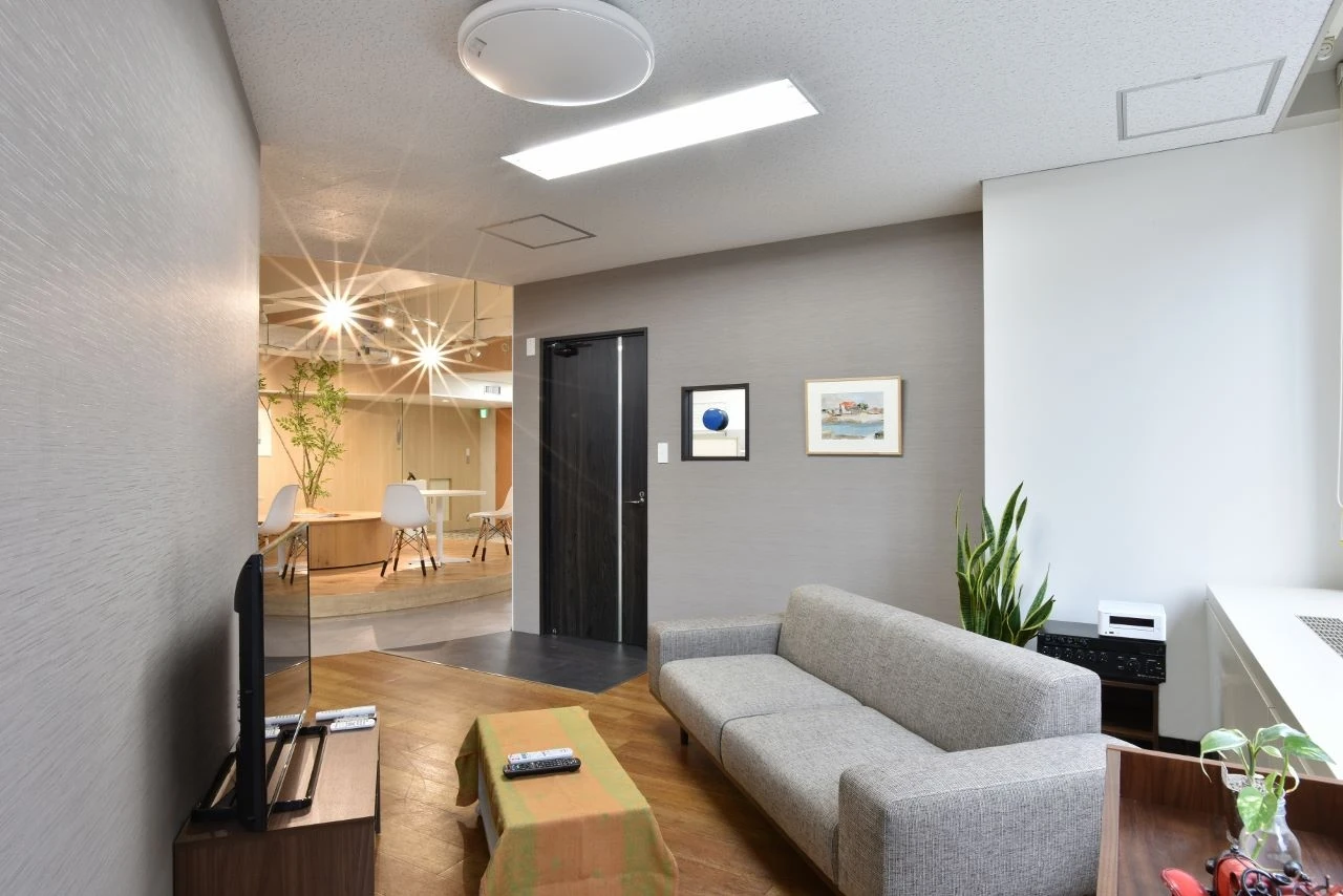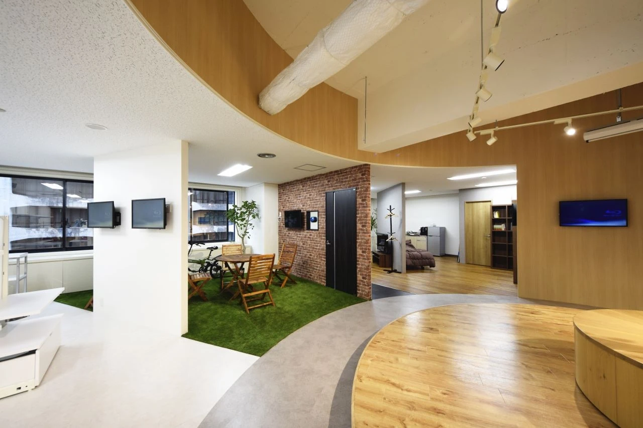 独自に開発されたAI防犯システムをお客様に体感していただくショールームは、人々の毎日の様々なシーンに寄り添い見護られている安心感とあたたかさがテーマ。曲線を用い空間のつながりを強調することで、やわらかな広がりを印象付けます。中央の回廊を進むと放射状に空間が隔てられ、それぞれショップスペース、屋外スペース、リビングスペースとして演出。全体はナチュラルな素材感でまとめることで、親近感のある優しい空間となりました。