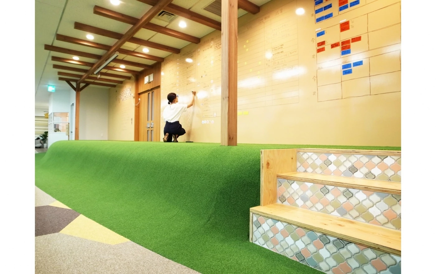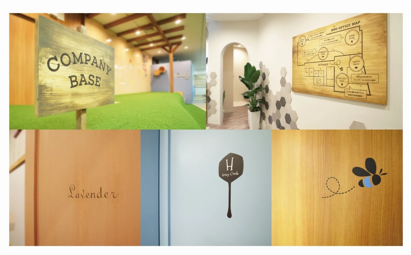 2度目のご移転となる今回は企業として更なる成長を実現できるオフィスをデザインしました。お客様から頂いた5つのフィス戦略〔 1.チャレンジ・成長 2.感謝・思いやり 3.つながり・絆 4.笑顔 5.自分らしさ 〕をもとに『Bbo×オフィス(BaseMake)×HAPPY(MakeUp)』というコンセプトを掲げそれぞれを実現できるスペースをゾーニング。ワークスペースのネーミングやサインプレート等、細部にまでこだわりました。社員一人ひとりが目標を持ち自走する組織へと変革するため、目標に向かって駆け上がっていくというイメージでオフィス内にシンボリックな丘を制作しました。リフレッシュルームは、外を眺めながら一人の時間を楽しめるカウンター、靴を脱いでくつろげる大きなソファ、用途によって自由な組み合わせができるハニカム型テーブルがあり、その日の気分によって場所を選べるようになっています。ミーティングルームはアロマの名前をテーマにネーミング。話し合う内容によって選択できるようにしました。全体のデザインイメージはオーガニック。希少価値が高く唯一無二な存在である社員の皆様をデザインの中に表現できたらという熱い想いを形に出来たオフィス空間となりました。
