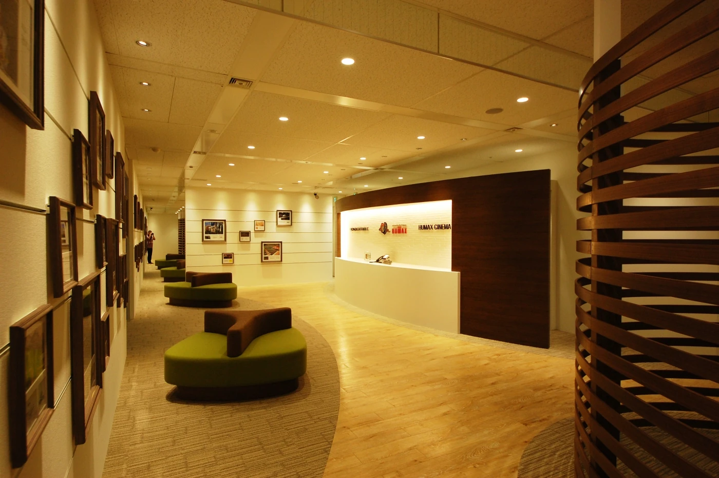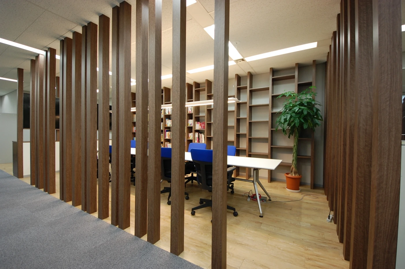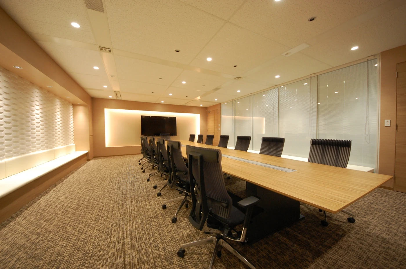 白色と木目を基調としたエントランス。壁面にはヒューマックス様で運営されている店舗のパネルを設置。やわらかな緑色のソファーは空間のアクセントにもなっています。広々としたスペースと落ち着きのある空間が訪れた人々のお出迎えをします。役員会議室の中央のテーブルには存在感のある突板で仕上げた台形の天板を採用。壁面にはリブ材や間接照明を、天井には明るさを調整できるダウンライトを取り入れ、高級感のある上品な空間の演出をしています。社員のみなさまがリラックスをしたり打ち合わせをしたり自由に使うことのできる「ラウンジ」はワークスペース内に設けました。ホテルのような優しくやわらかい雰囲気の空間です。全ての空間において、フロア全体の色のバランスを考えながら家具や素材を選定し、統一感を感じられる品のあるオフィスが誕生しました。