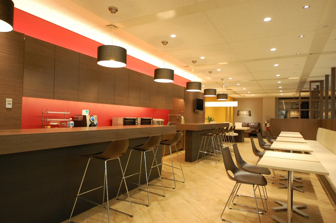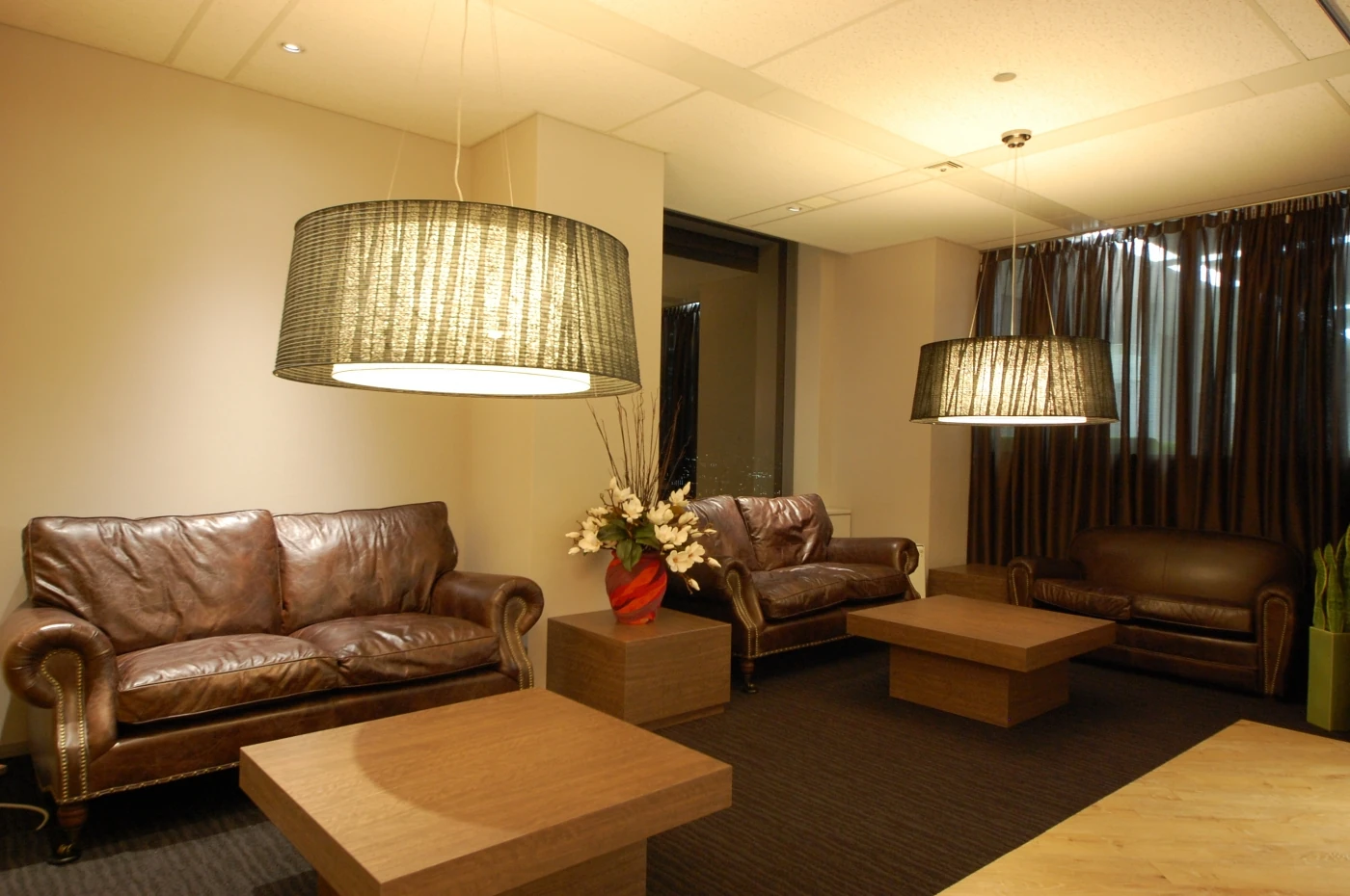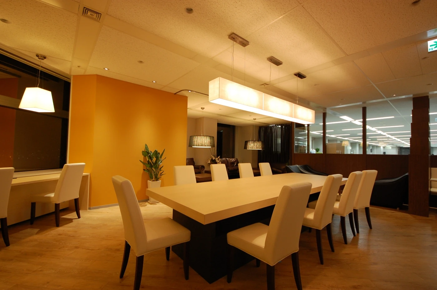 白色と木目を基調としたエントランス。壁面にはヒューマックス様で運営されている店舗のパネルを設置。やわらかな緑色のソファーは空間のアクセントにもなっています。広々としたスペースと落ち着きのある空間が訪れた人々のお出迎えをします。役員会議室の中央のテーブルには存在感のある突板で仕上げた台形の天板を採用。壁面にはリブ材や間接照明を、天井には明るさを調整できるダウンライトを取り入れ、高級感のある上品な空間の演出をしています。社員のみなさまがリラックスをしたり打ち合わせをしたり自由に使うことのできる「ラウンジ」はワークスペース内に設けました。ホテルのような優しくやわらかい雰囲気の空間です。全ての空間において、フロア全体の色のバランスを考えながら家具や素材を選定し、統一感を感じられる品のあるオフィスが誕生しました。