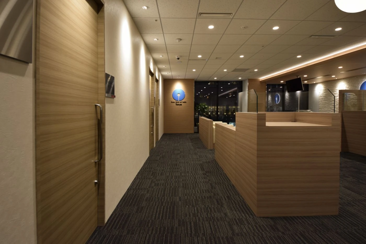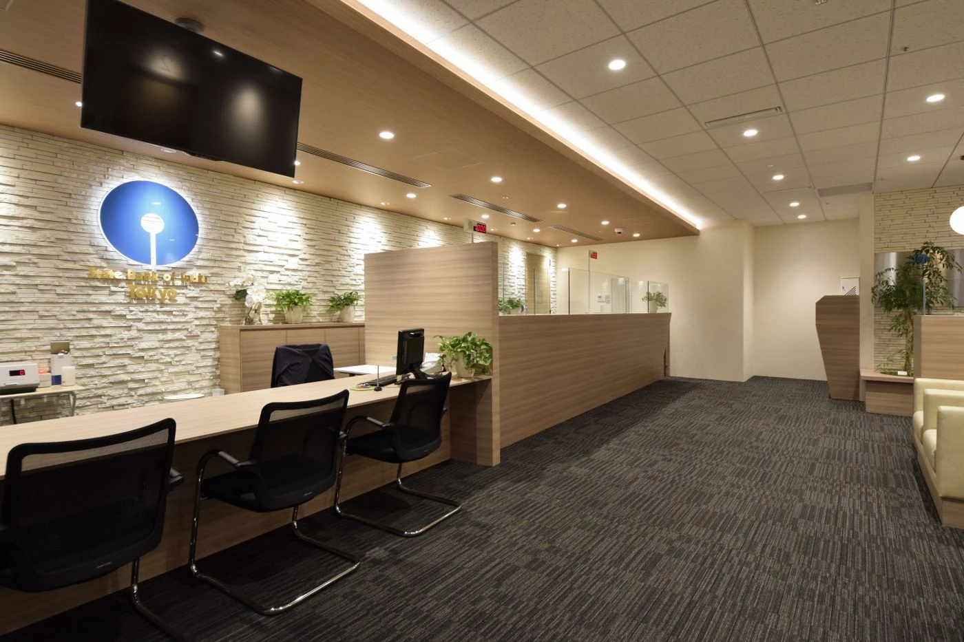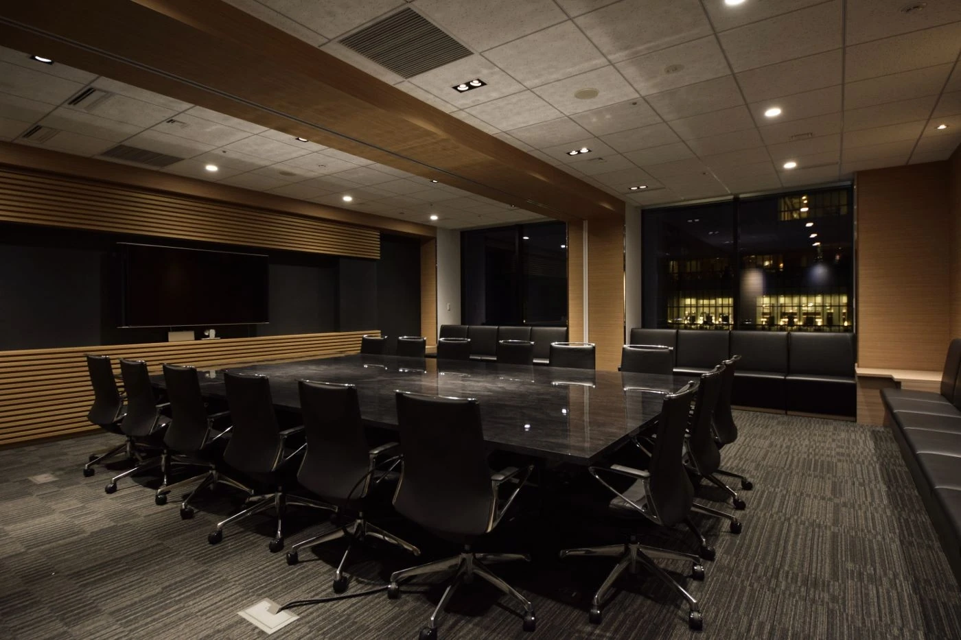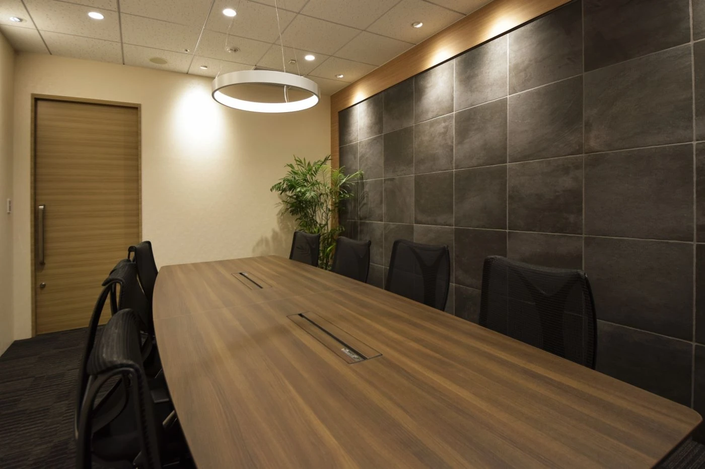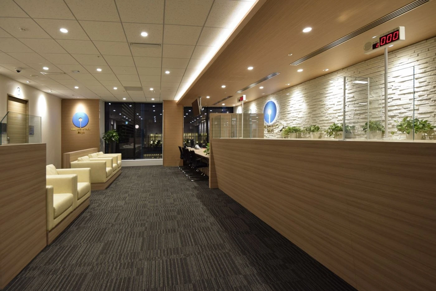 東京支店の移転プロジェクトに携わらさせていただきました。銀行という様々なお客様が来訪されることから、安らぎや信頼感を感じていただけるよう"おもてなし"というコンセプトからデザインしていきました。やわらかい明るめの木目柄と白色を基調に構成して、安らぎを感じる空間にしました。木目柄は横方向に流れるようにして、動きを出しました。応接室は、各室に異なったペンダントライトを設けて変化をつけています。大会議室は他の空間と異なり、黒色と木目柄で構成しております。周囲に造作のソファを配置しており、大勢でのミーティングも可能です。来客者だけでなく社員の方々にも居心地の良さと安らぎを感じていただける"おもてなし"空間の完成です。