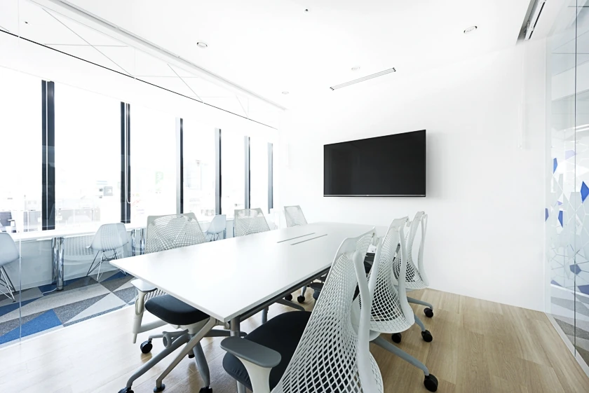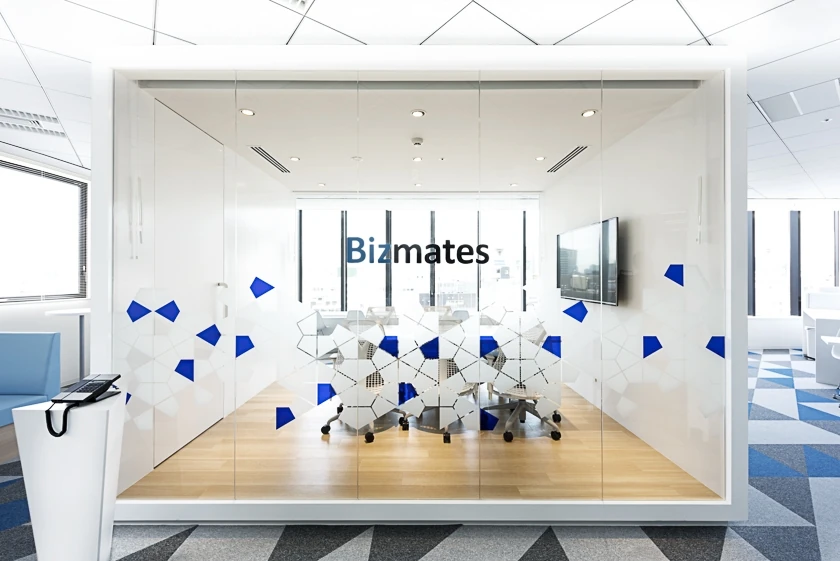 人と人との「多面的なつながり」を表した幾何学模様を使用したデザイナーズオフィスです。コーポレートカラーの青をアクセントに壁や家具を白に統一することで、清潔感や先進的な印象を感じさせます。エントランスにはボックス型の会議室を設置し、訪れた方に大きなインパクトを与えています。また10Fのビルへのご入居ということから、窓側にカウンタースペースを設置し、外の眺望を見ながらリフレッシュできる空間を作りました。