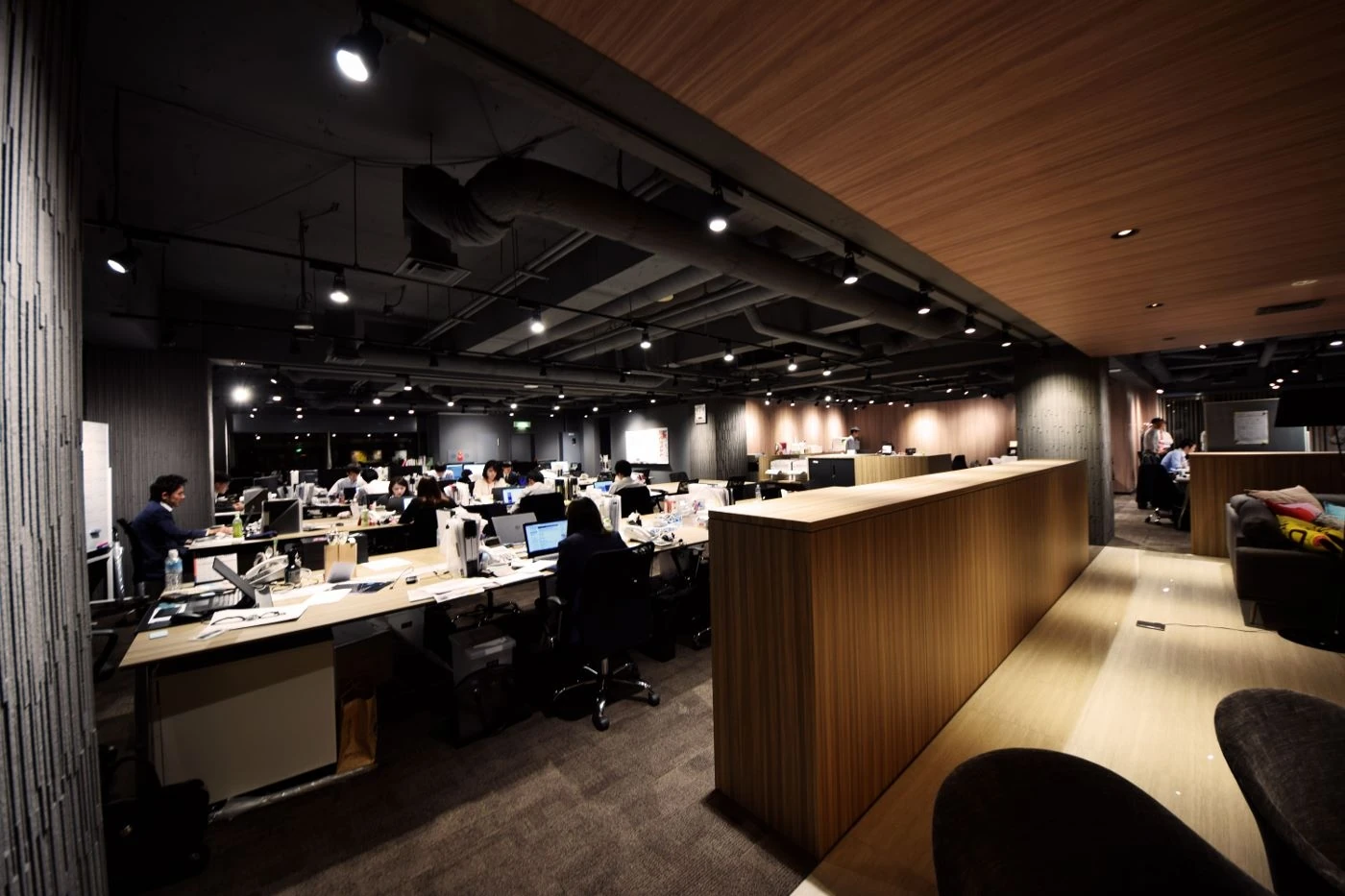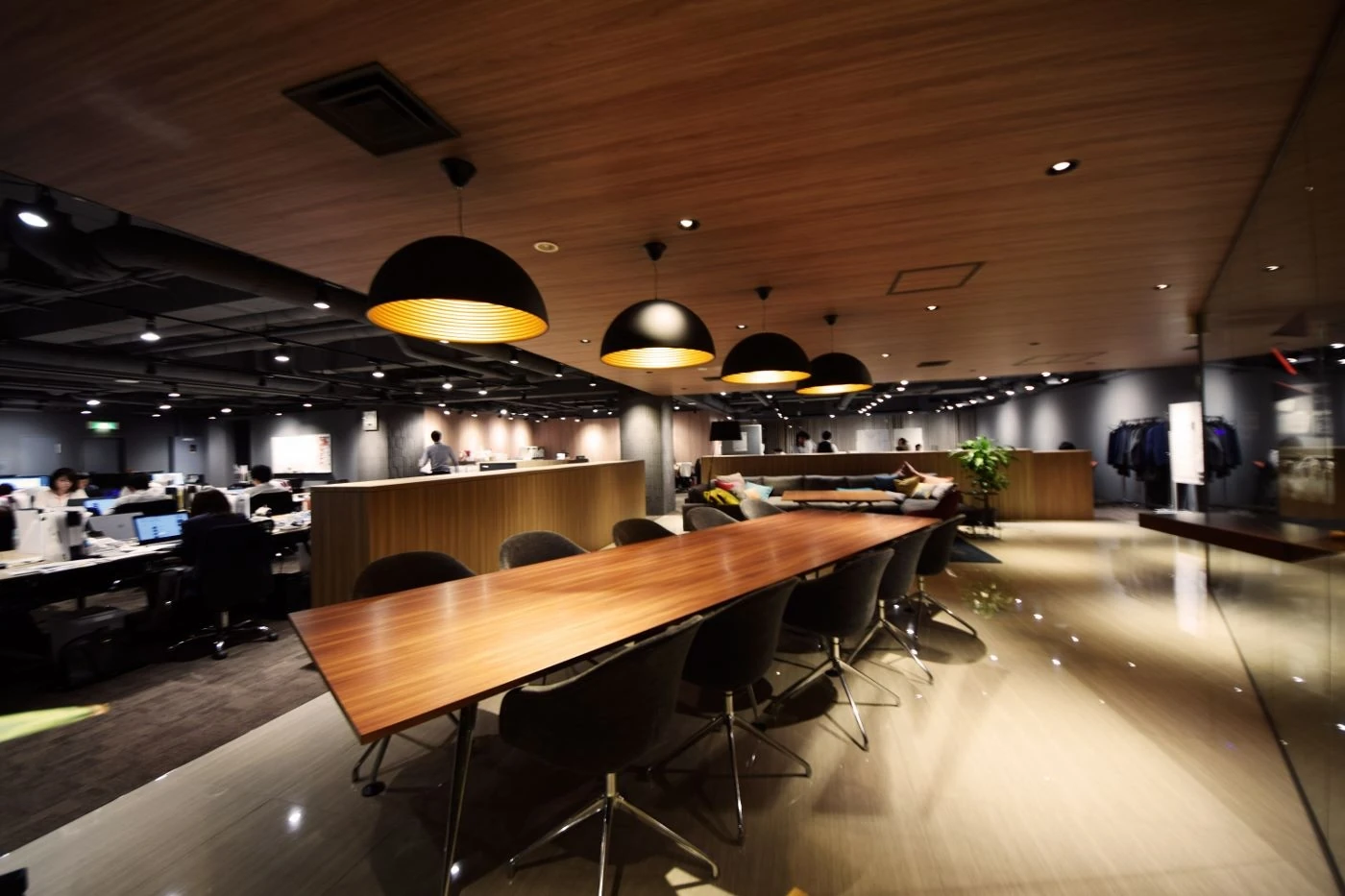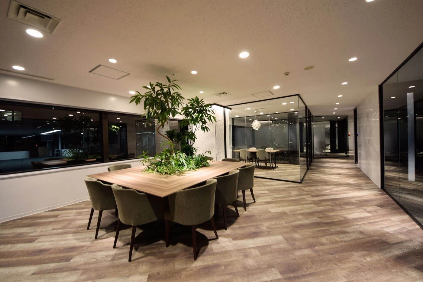 壁をほとんどたてず、魅せるオフィスを作りました。エントランスからの眺望を全てガラスにすることで、働いている様子をあえて見せるよう設計し、来訪者に臨場感と一体感を感じてもらえるよな空間を目指しました。エントランスのカウンターはガラスから突き出しているのもポイントです。解放感を出すため、ワークスペースはスケルトン天井にし、パブリックエリアの天井と高低差をつけショーケースさを演出しています。一つ一つの家具選定にもじっくりと時間をかけ、空間に合うデザインのもので構成。全てにおいてこだわり抜いたオフィスとなりました。