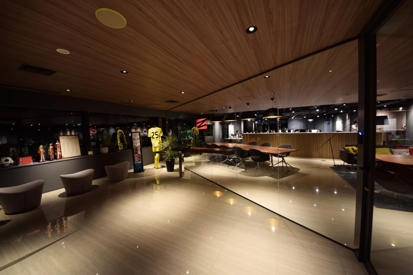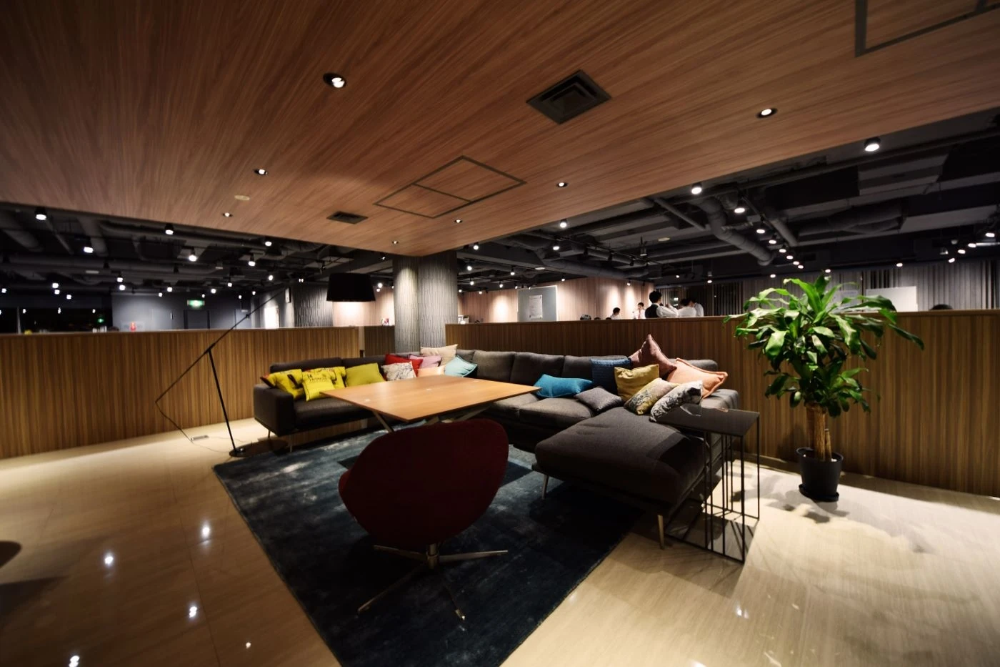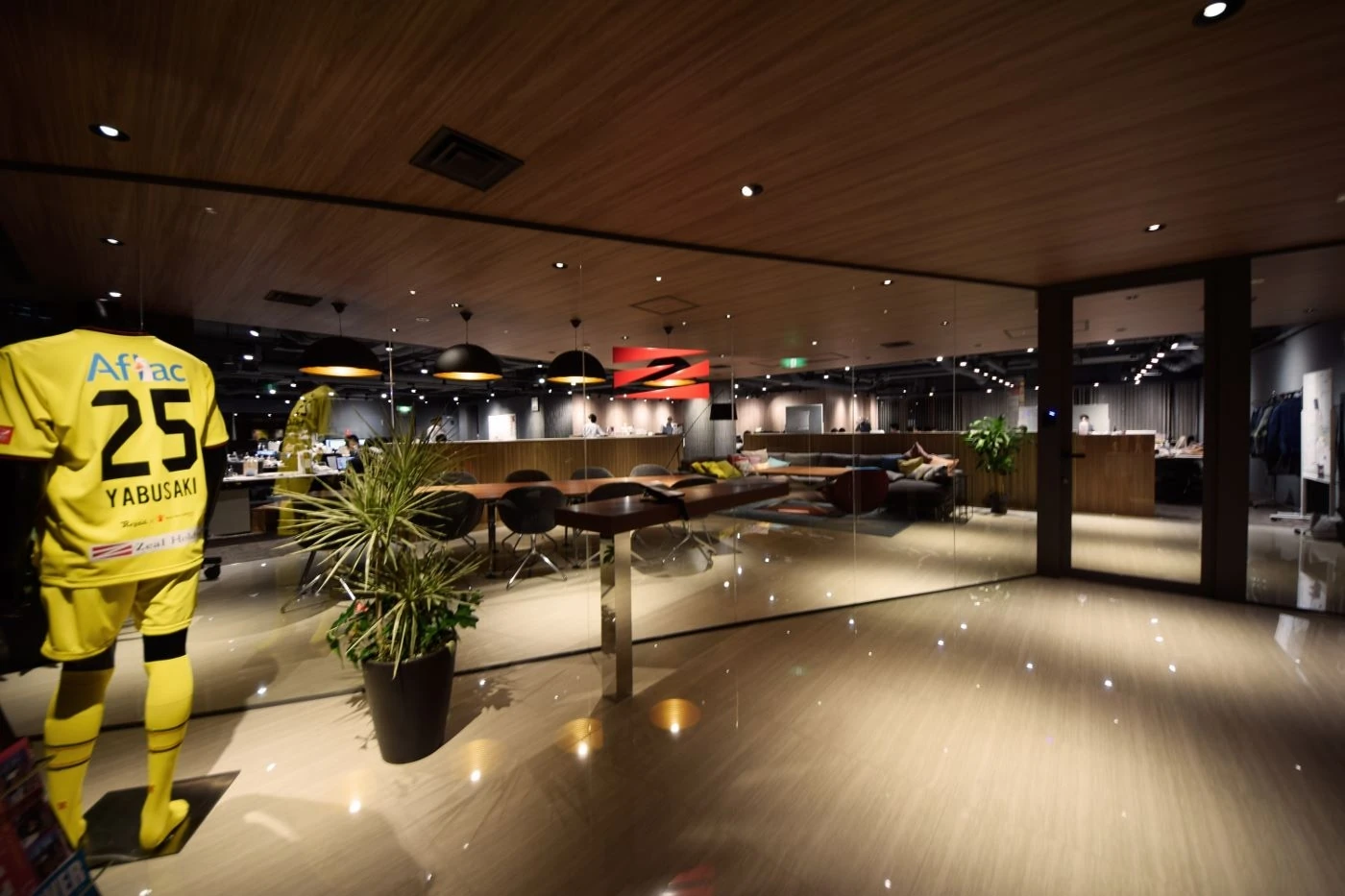 壁をほとんどたてず、魅せるオフィスを作りました。エントランスからの眺望を全てガラスにすることで、働いている様子をあえて見せるよう設計し、来訪者に臨場感と一体感を感じてもらえるよな空間を目指しました。エントランスのカウンターはガラスから突き出しているのもポイントです。解放感を出すため、ワークスペースはスケルトン天井にし、パブリックエリアの天井と高低差をつけショーケースさを演出しています。一つ一つの家具選定にもじっくりと時間をかけ、空間に合うデザインのもので構成。全てにおいてこだわり抜いたオフィスとなりました。