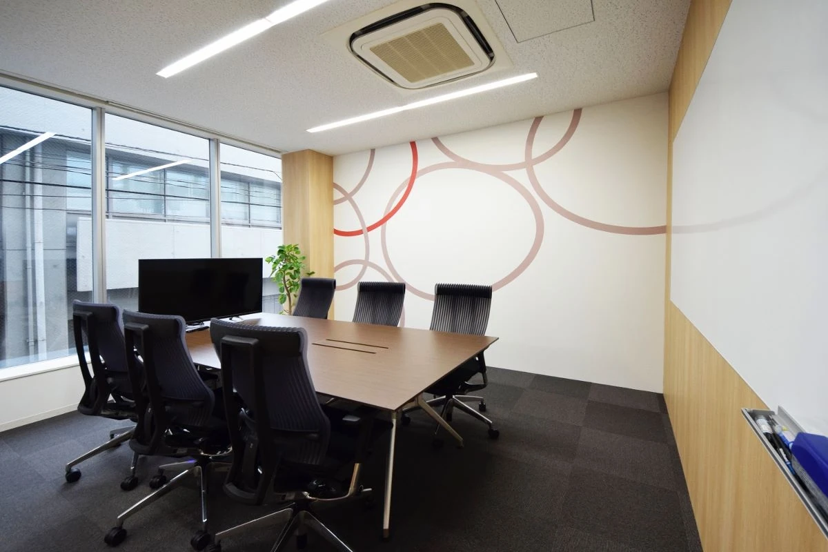 また会議室の壁面にもロゴを表現したグラフィックシートを施し、全ての空間でブランディングを高めております。