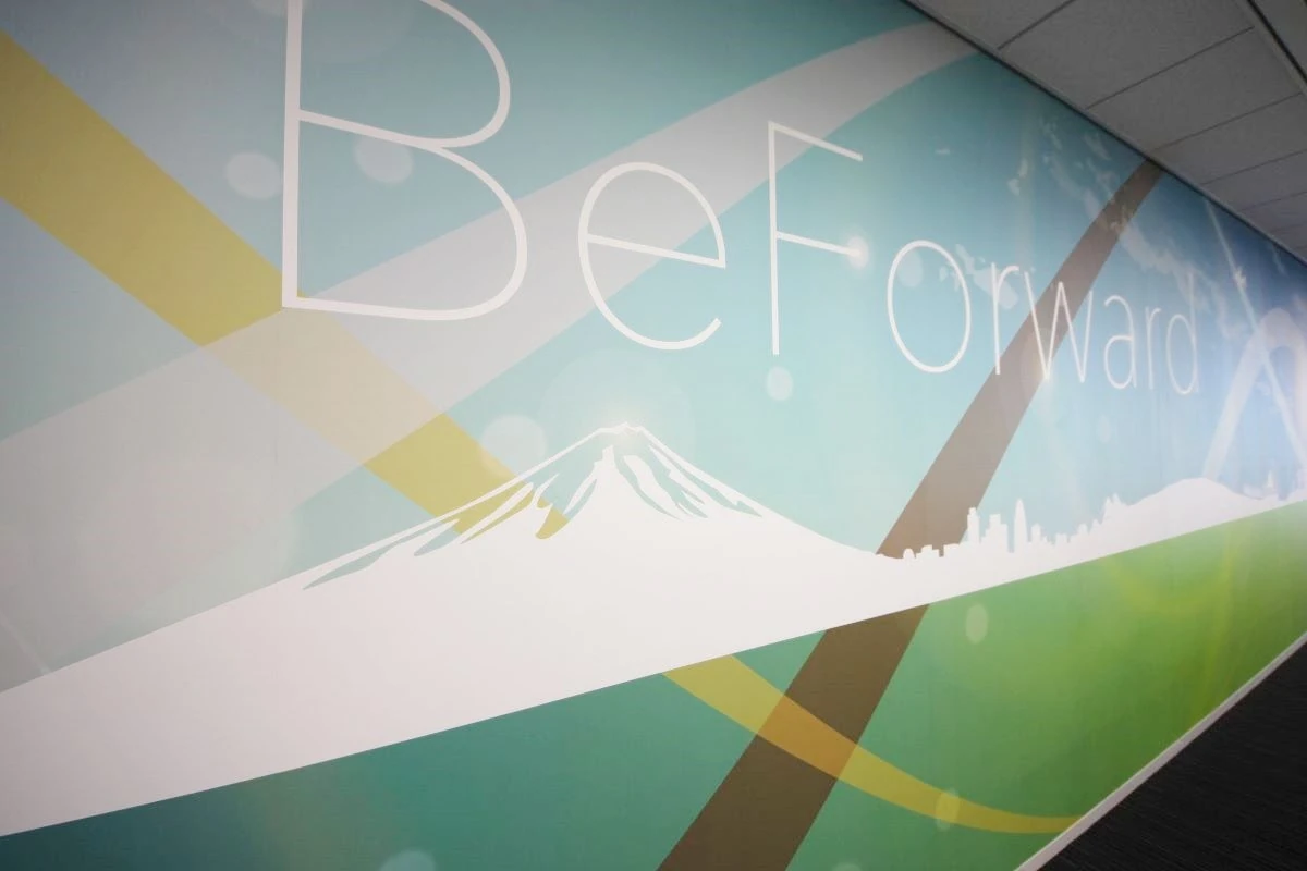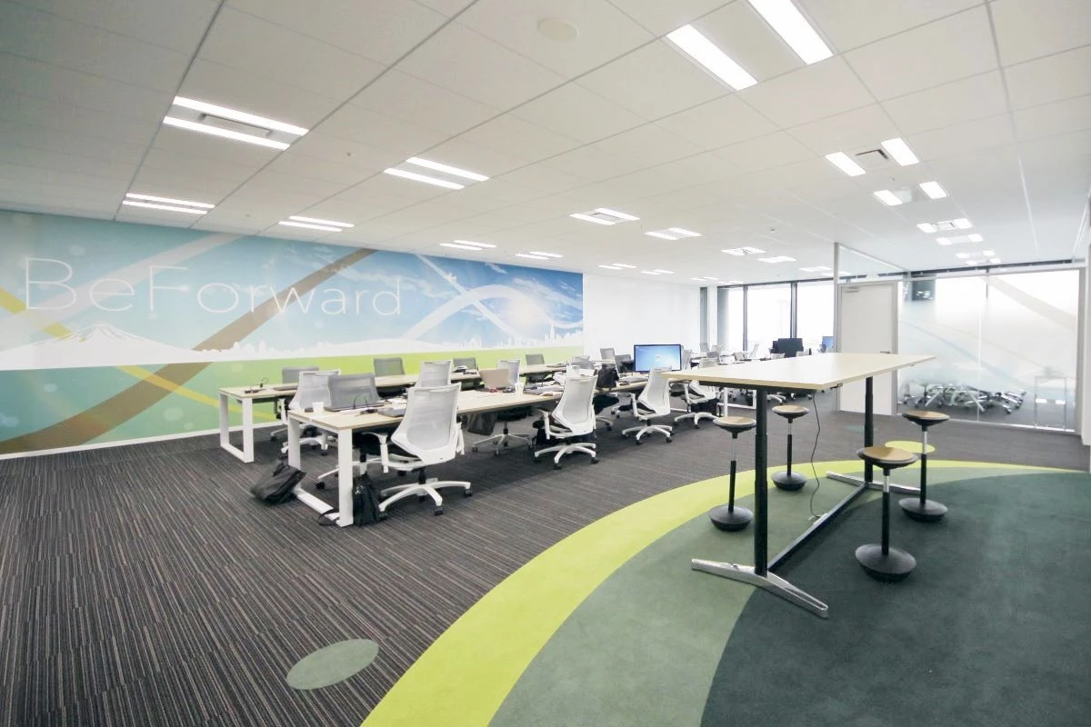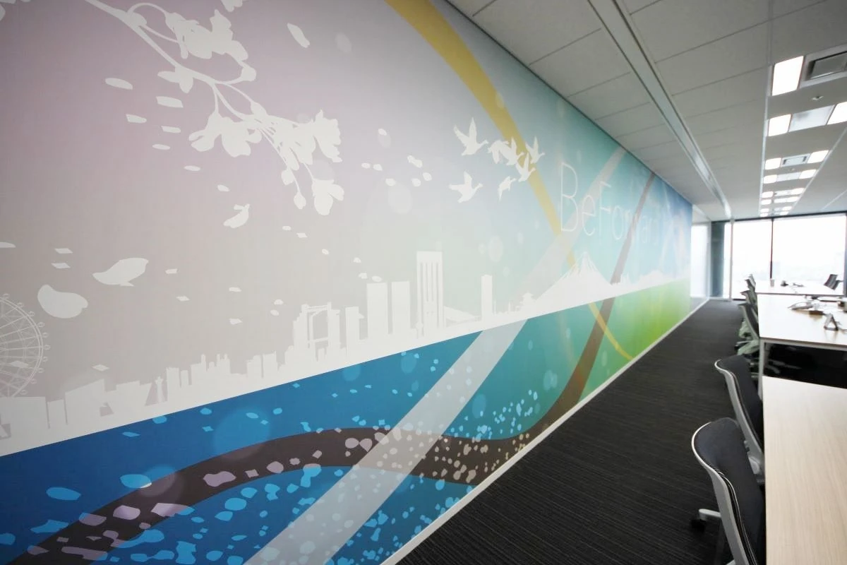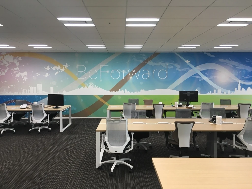 株式会社BeForward様のオフィスはご移転時にお手伝いし、今回拡張増床のタイミングでお声掛けを頂きました。これまでのデザインを引き継ぐのではなく、「新たにグローバル化に対してインスピレーションを感じさせる」「インパクトのあるデザイン」をご要望頂き、ワークスペース内の大きな壁面を活用したオリジナルグラフィックデザインを御提案しました。世界を感じさせるデザインながらも、大きな曲線が躍動感を、そして鮮やかな彩りが空間の明るさを演出し、全体的にインパクトのある印象に仕上がりました。