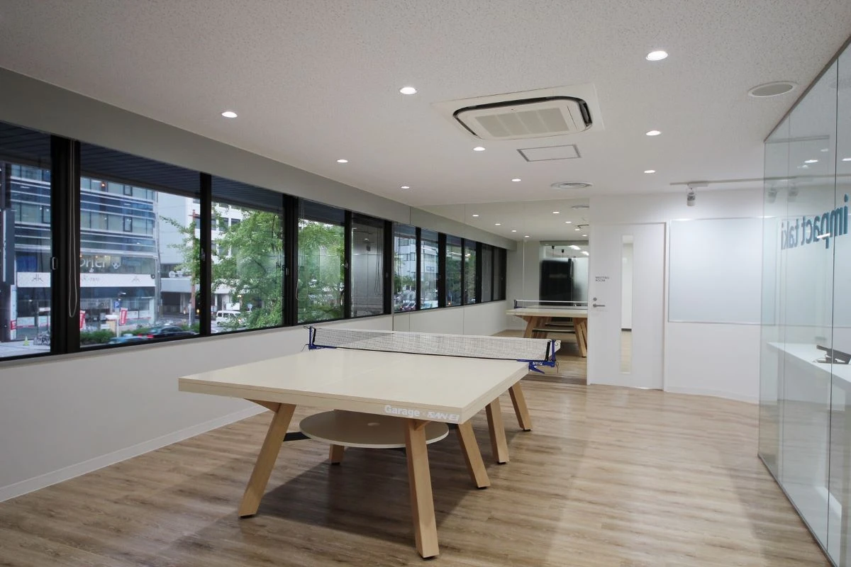 エントランスは、透明ガラスを使うことで視界を遮らないデザインにしました。奥の卓球台はミーティングテーブルとしても使用することが可能です。作業台としても使用可能な大型テーブルや天板昇降式のテーブル、低めのソファを配置しリフレッシュスペースを兼ねたミーティングエリアなども設け、以前のオフィスよりも多様性に富んだミーティングスペースになりました。「白」と「木目」でフロア全体を纏めることで、オフィス全体のデザインに統一感を持たせています。新規購入什器は「白」と「グレー」で同系色で纏め、柔らかな印象の空間にしました。フロア中央の柱とオフィス用のバランスボールは黒色にし、アクセントになっています。