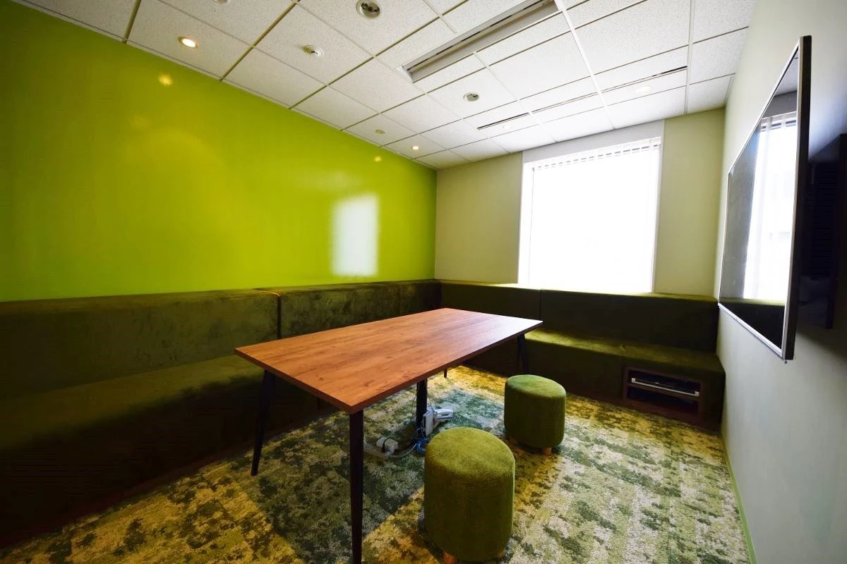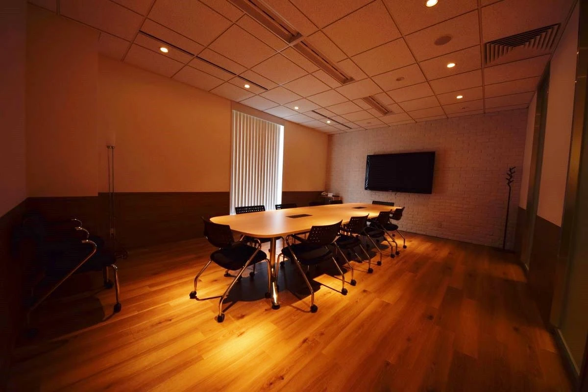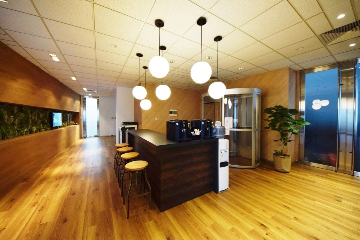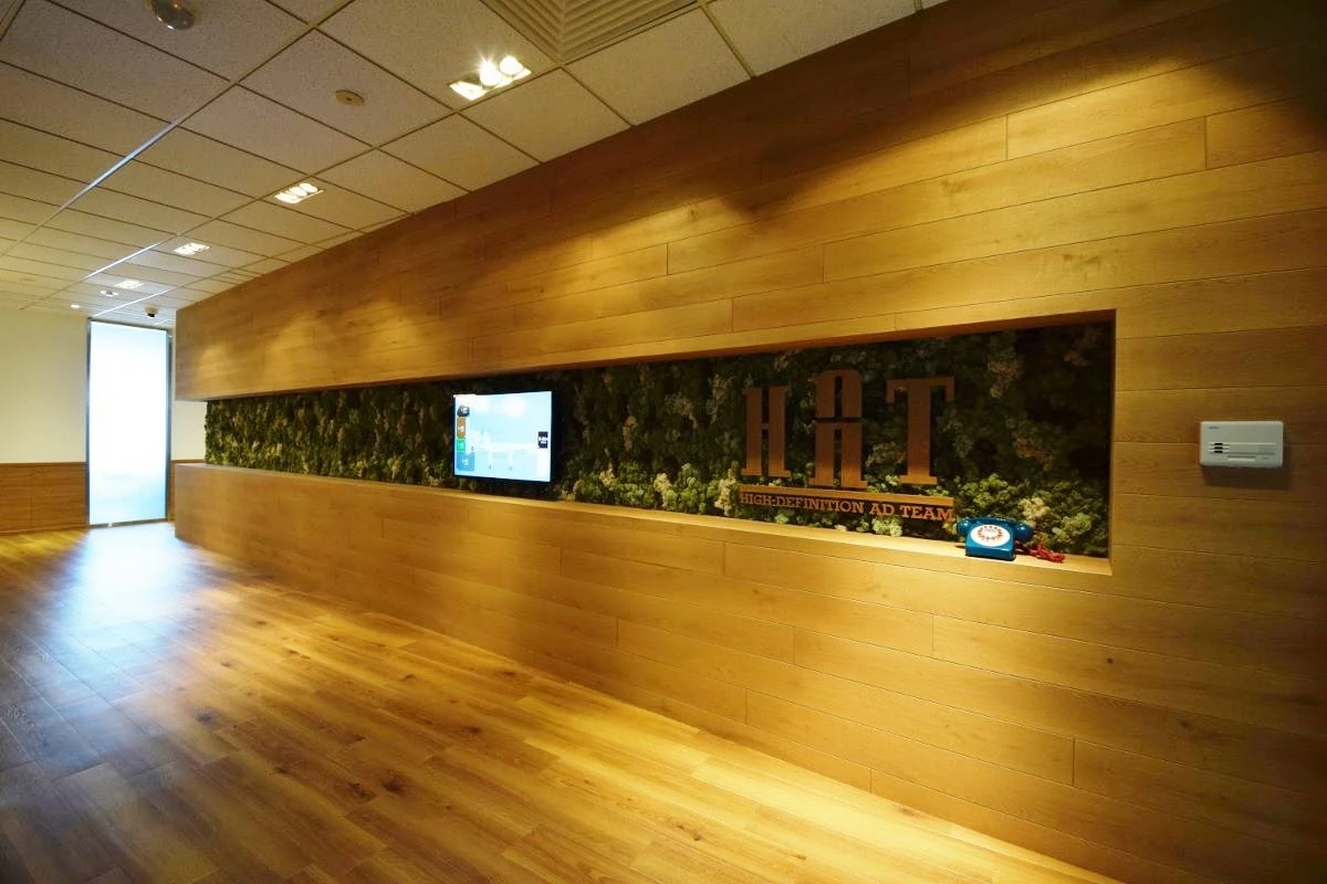 木々(木目柄)の印象からもたらす、爽やかで温かい、親しみある雰囲気。ハット様と出会ってから感じた印象を、コーポレートカラーであるグリーンをアクセントで使用し様々なスペースをデザインで表現をいたしました。来客用エントランスからの各会議室は、多くの方が三者三様の目的で来られるということで、それぞれ異なったコンセプトを設けデザインしました。オフィスをつくるにあたり、「ワクワクをこの空間で体現し、更にワクワクするような映像をこの場所から発信したい」という想いと、他にはない「ハット様らしさ」とは何なのかを常に考え、幾度も打ち合わせを重ねました。ご一緒に素材や家具を選定するなど、ハット様と共に創り上げたこだわりのデザイナーズオフィスとなりました。