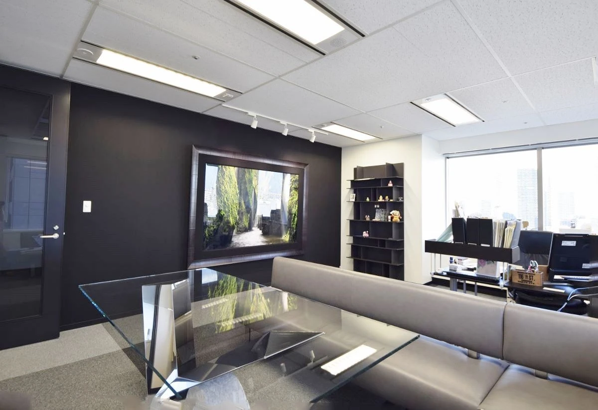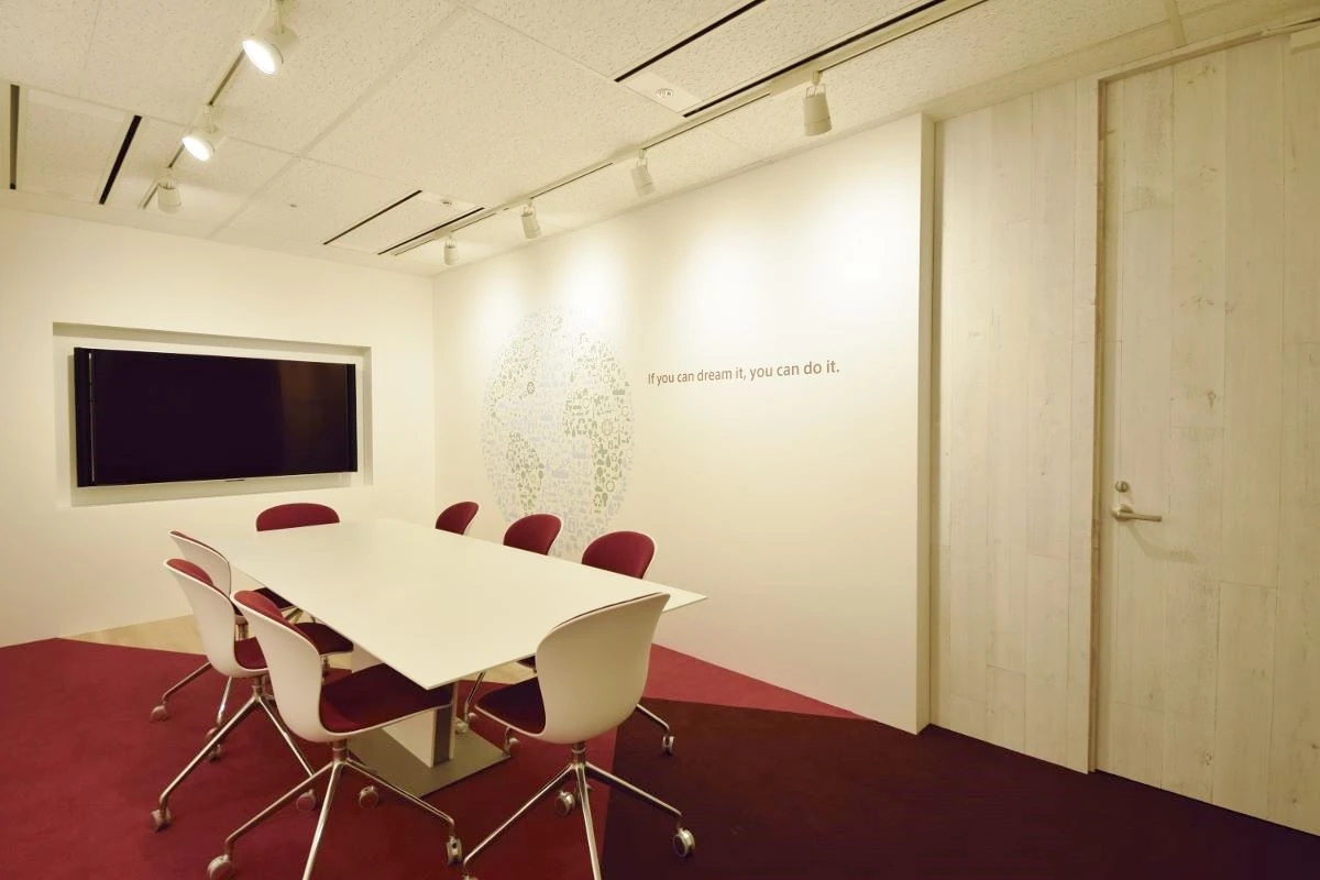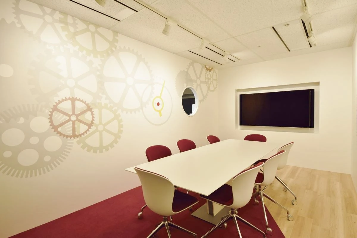 「不思議の国のアリス」をイメージして、一度入ったら抜け出せない迷宮の様な、けれども誰もが居心地よく幸せになれる場所、をコンセプトにプランニングしました。不思議な世界への入り口となるエントランスは、無垢材とブリックタイルを使用し、シンプルながらも洗練された空間に。会議室の壁には、歯車や時計、地球などをモチーフとしたグラフィックを大胆にデザインしました。地球のグラフィックデザインでは、日本から世界へ発信していきたいというお客様の想いを表現しました。床の貼り分けはトランプをイメージしています。ワークスペースのデスクもオリジナルで製作し、お客様の想いを大事にし、社内ではたらく方が常に意識を高く、幸せになれる空間にしました。