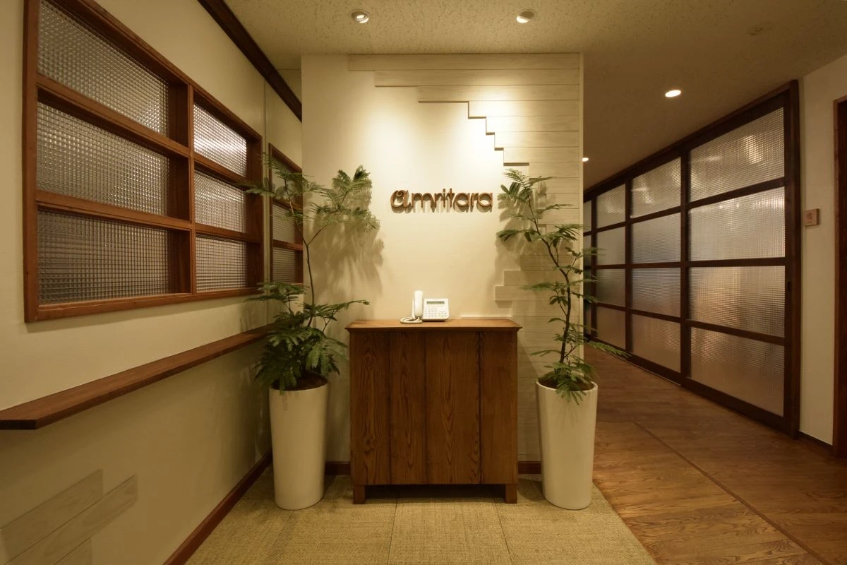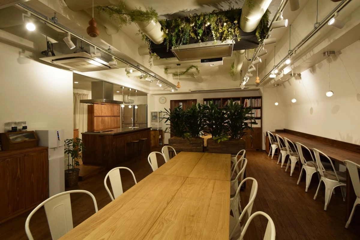 オーガニック商品を取り扱っているアムリターラ様の世界観を体現できるオフィス計画に携わらせていただきました。内装材も接着剤から化学物質を一切使用せず、天然素材で作り上げました。天然木材と白の漆喰壁で構成した空間に、グリーンやペンダントライト、ひょうたんスピーカーでアクセント付けしました。ビッグテーブル脇にはキッチンスペースがあり、打合せや会議はもちろん、みんなが集まって料理や食事を楽しめるコミュニケーションスペースになっています。天然素材に囲まれ、自然と深呼吸をしたくなるオフィスの完成です。