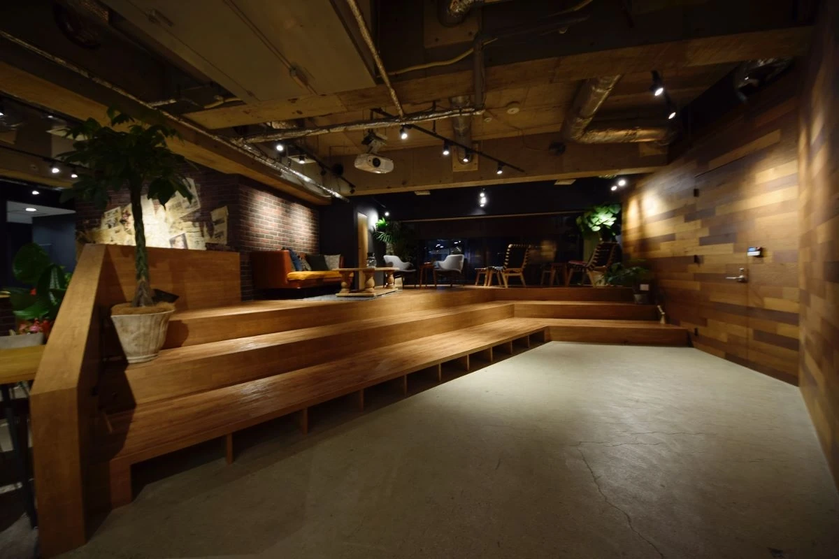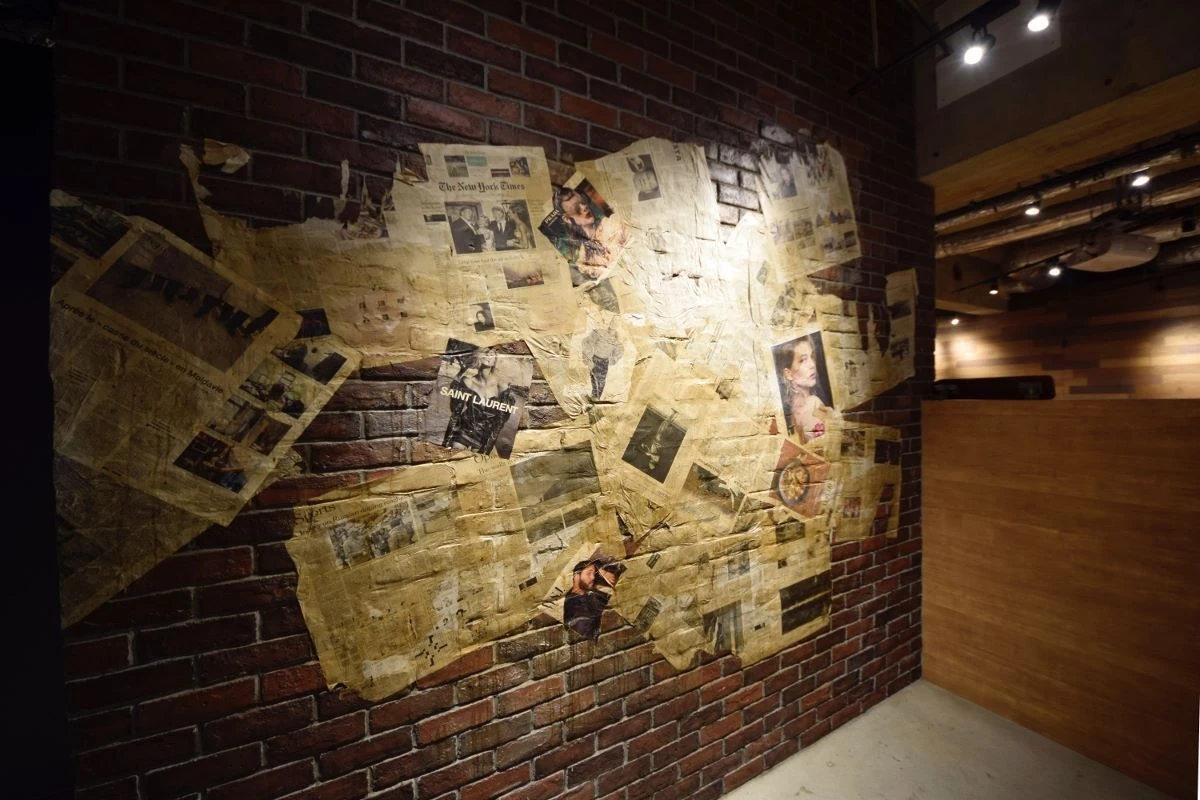 エントランスのラウンジ部分はスケルトン天井に仕上げ、受付電話エリアは敢えて天井を抜かずに高低差をつけて空間の奥行きを演出しました。壁面の木目(不燃認定品)は本物の木を使用し、床のモルタルと自然の木との無機と有機の融合が一つのこだわりです。タイル張りの壁も、ただタイルを張るだけではなく、飾り付けとして英字新聞を貼って剥がすを繰り返しエイジングの加工をしています。アメリカの路地裏のようなしつらえにしました。