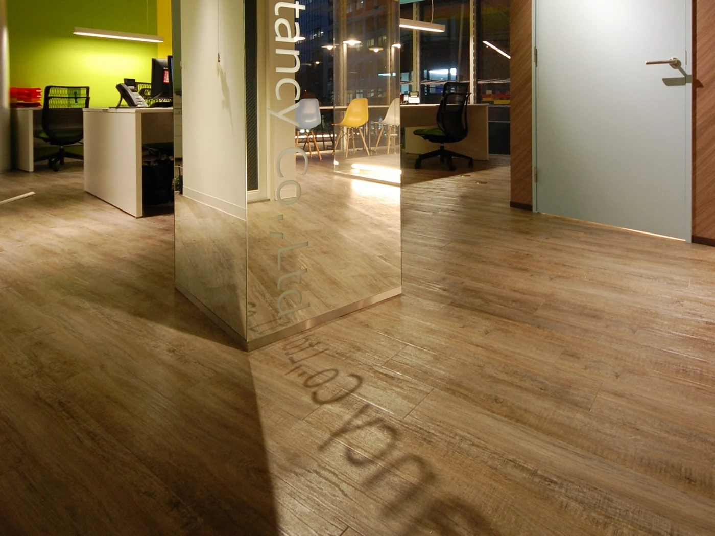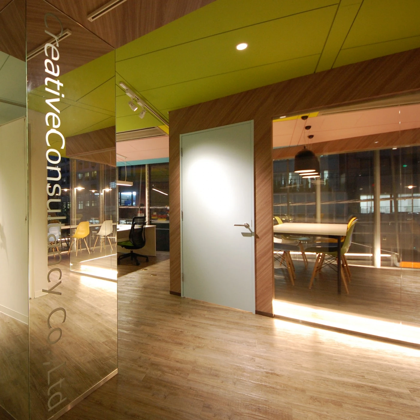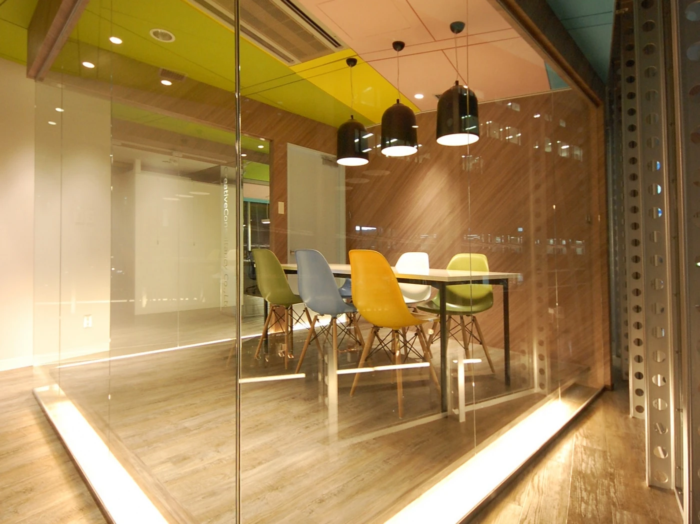 部屋の中にガラス箱を置いたような会議室は、空間そのものがショールームのよう。お客様と一緒に選んだこだわりの色や家具は、他には決してない、オンリーワンの大切な空間に仕上げています。昼と夜の表情の違いも楽しめる、クリエイティブコンサルタンシー様ならではのオフィスです。