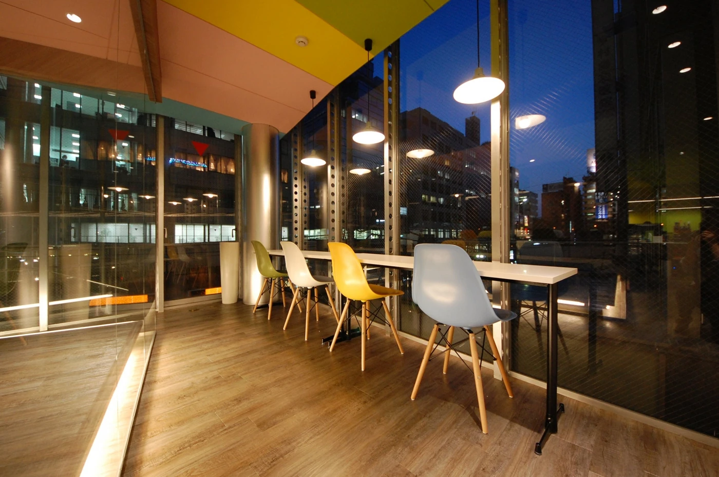 骨董通りに面するガラス貼りのビル。カラフルな壁と天井に、思わず目を奪われてしまいます。オフィス感をなくし、とにかくポップに仕上げました。ポップさと木目が上手に調和し、優しさと楽しさを与えてくれています。