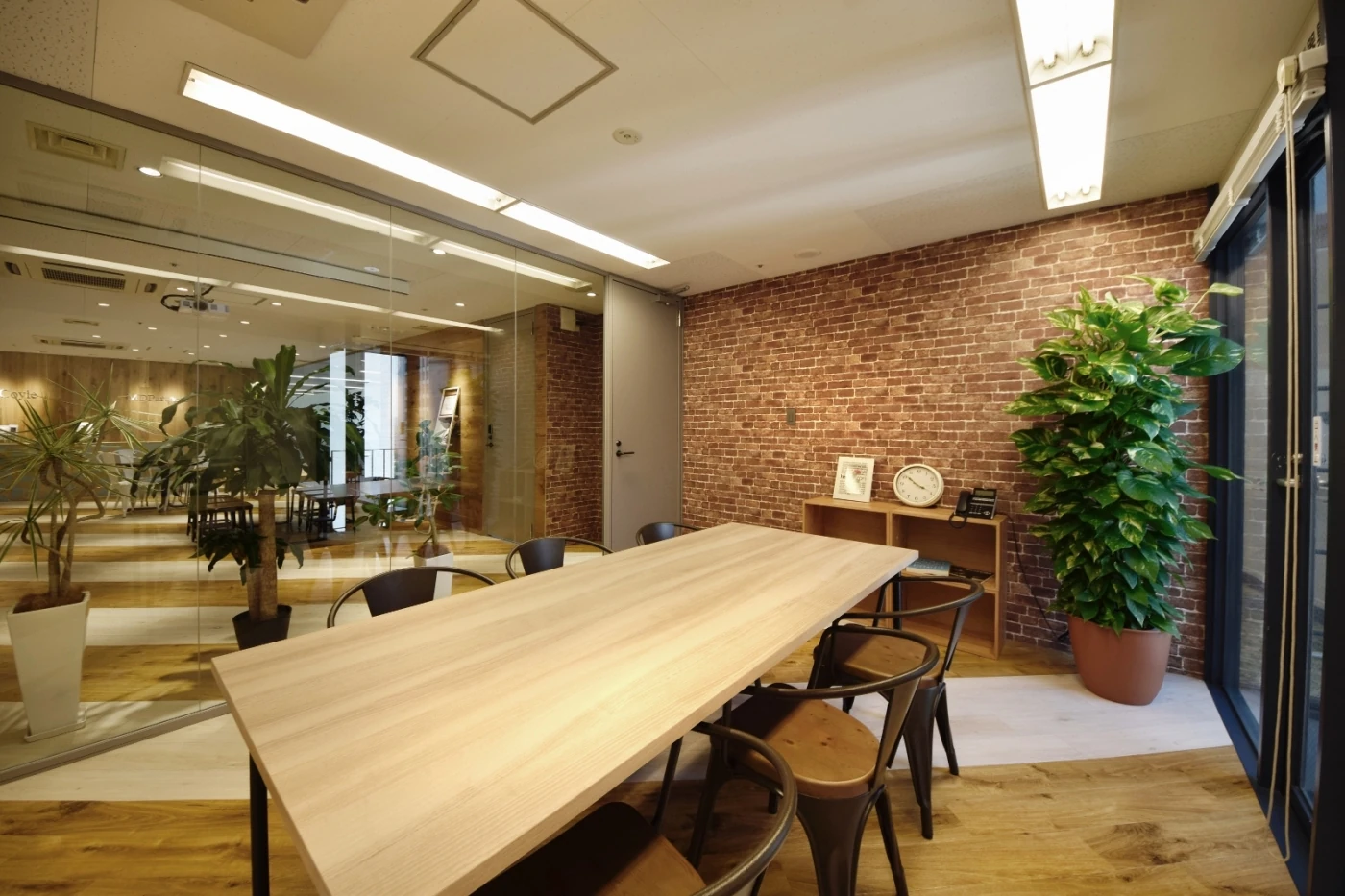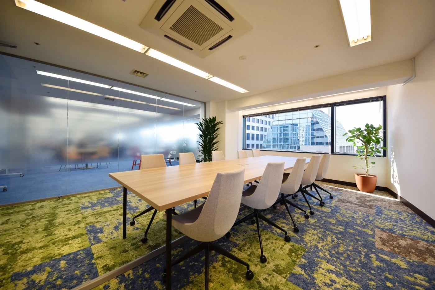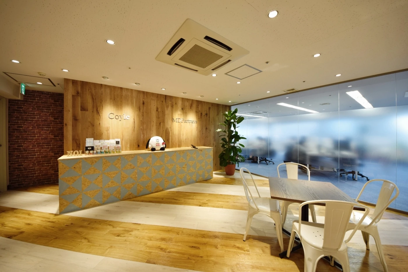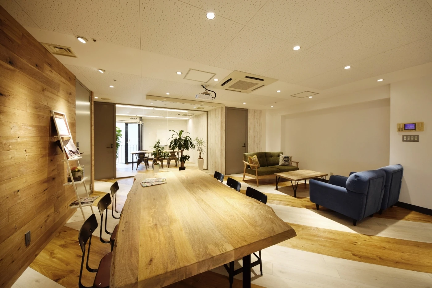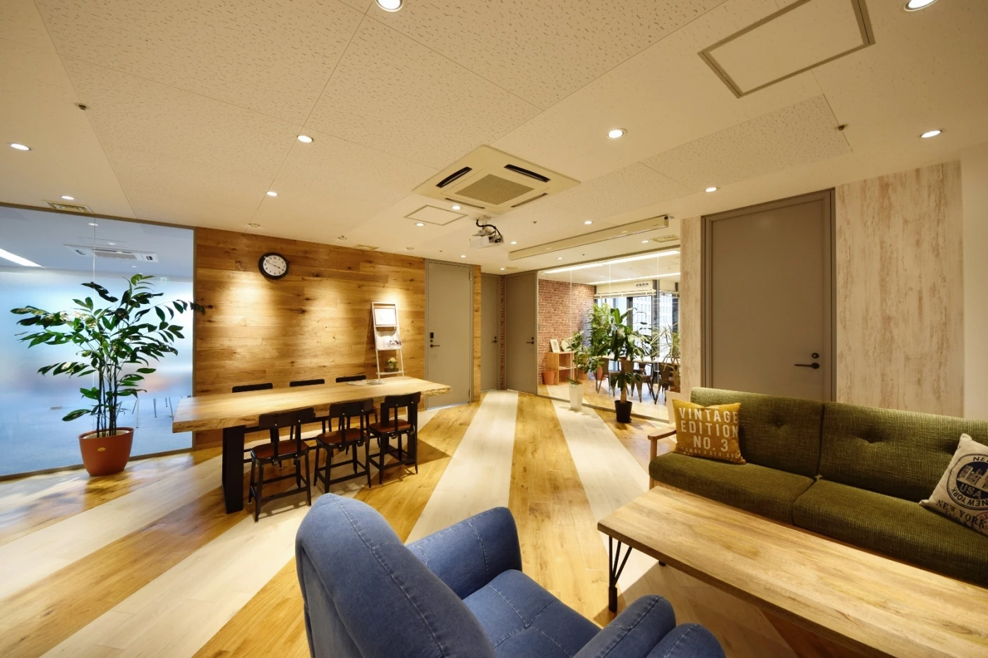 外苑前駅から徒歩30秒。アクセス抜群の立地に「Terrace」をコンセプトとしたオフィス空間が誕生しました。エレベーターを降りると、テラスを思わせる広々としたエントランス兼オープンスペースが目の前に広がります。床は木目調の塩ビタイルを斜めに2色使いで貼ることで、入った瞬間に奥行き感が感じられるデザインに。壁にもさまざまな木目を使い、貼り方を変えてあげることで温かみがありつつも斬新なイメージを与えます。1部屋から3部屋に増えた会議室は、全て異なるテイストに仕上げる事で目的や気分に合わせて使い分けをして頂けます。