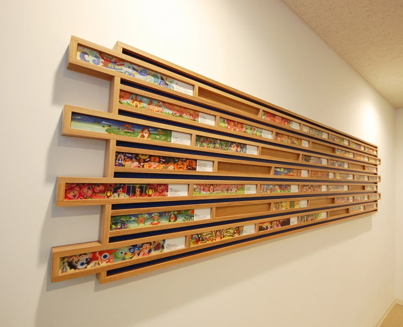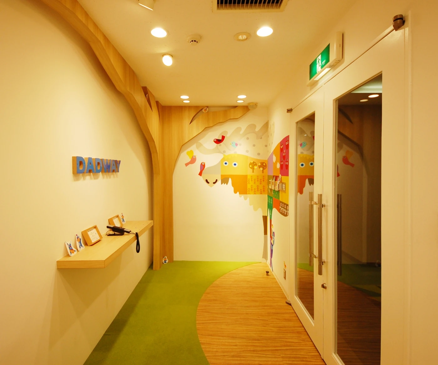 森をモチーフにしたエントランスの壁には余白をもうけて、そこに社内のデザイナーさんが動物を描き、随所に小人さん達も配置。憩いの森のエントランスが完成しました。応接室にもコダワリが。デザイナーさんが手掛けられた、歴代の企業ホームページのバナーを、オリジナルの什器を製作して壁に掲示。子供とのふれあいをテーマに描かれており、訪れた人との会話も弾みます。リフレッシュは、のびのびと寝転がれる大きな畳を設置。おうちの様にくつろげる空間を目指しました。ダッドウェイ様らしい、楽しさあふれるオフィスが完成しました。