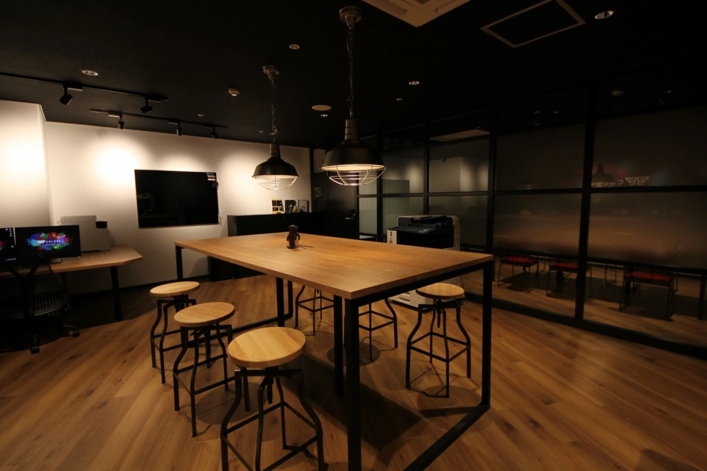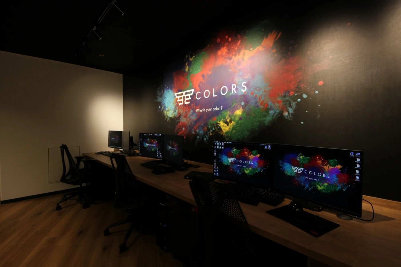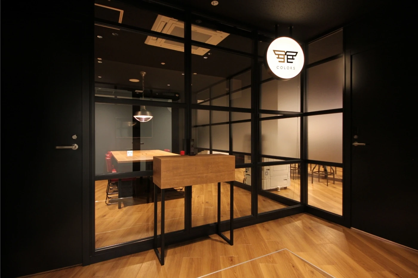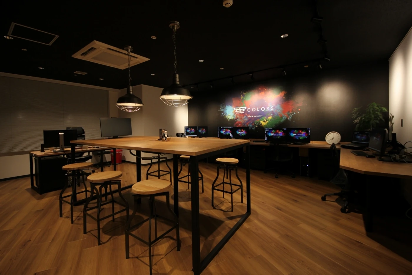 3DCADの設計技術を用いて商品開発に力をいれるCOLORS様の新オフィスは、クリエイターが快適に集中して働ける環境を重視し、メディアへの露出も考慮した「魅せるオフィス」です。執務室の全てを木目のフローリング調の床で貼り替え、天井は黒く塗装。全体の照明をダウンライトとスポットライトだけで構成することで、オフィス全体の照度を落とし、ディスプレイを見易い設計にしています。また、ワークスペースのメインとなる壁面には、COLORS様オリジナルのデザインで、グラフィッククロスを施工。『モノづくりに新たな色を添える』というCOLORS様の事業を明確に示した、特別な空間に仕上がりました。