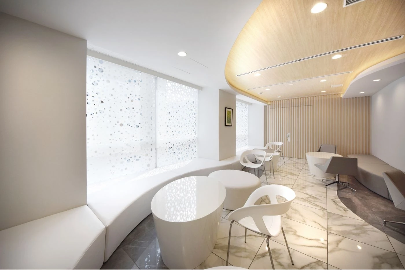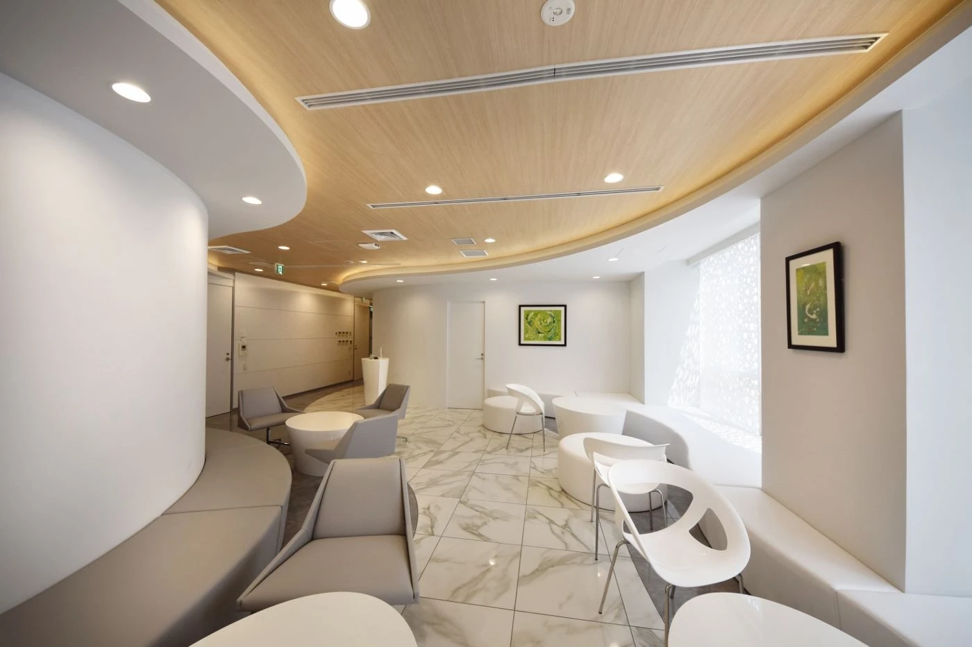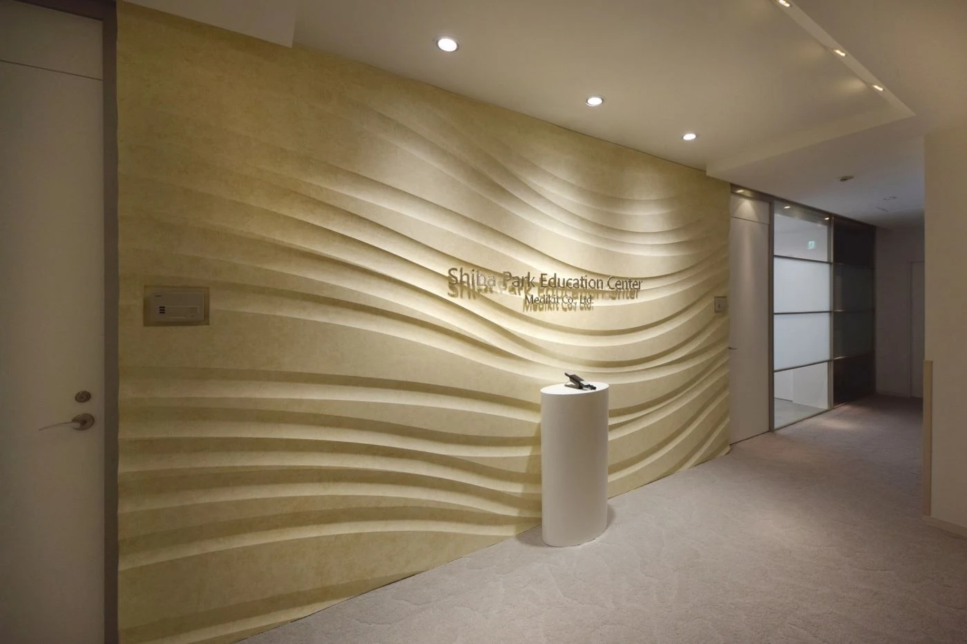 取り扱い製品のトレーニングセンターとしてSPEC(Shiba Park Education Center)を開設されるにあたり、「人と人とを紡ぐ」をコンセプトに、オフィスデザインを手掛けさせていただきました。「凛・柔和」をキーワードに、芯のある企業としての力強さを感じさせながらも、どこか温かくおもてなしの心が伝わる様、全体的に流れるようなデザインで柔らかなイメージを演出。お客様をお通しするサロンスペースは、医療に携わる企業として「清潔感」「信頼感」をより強く感じて頂けるようにホワイトで統一しました。一部にナチュラルな木目や柔らかな光の間接照明を施すことで、より優しい印象になるように空間をデザインしました。