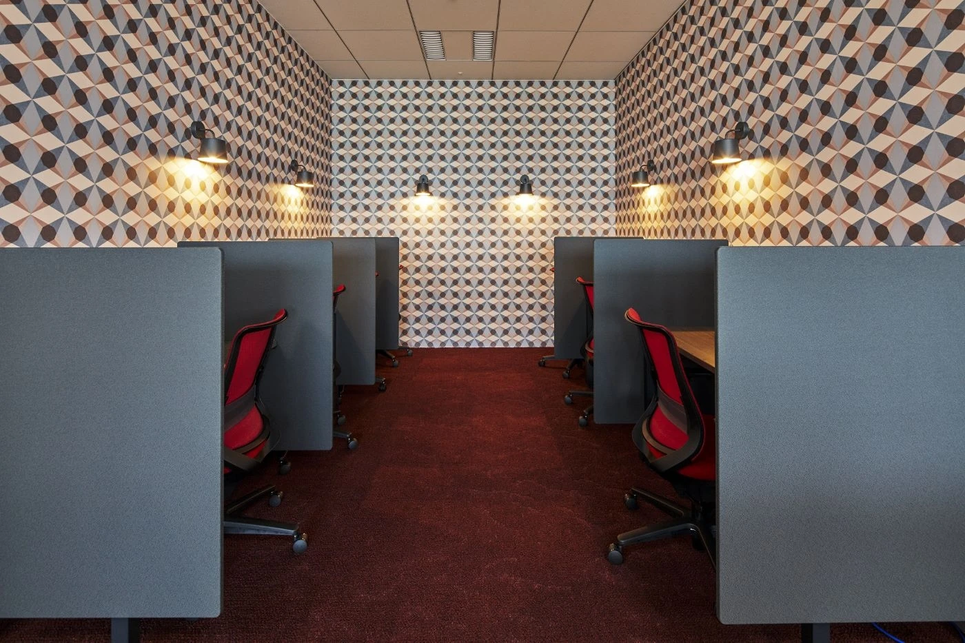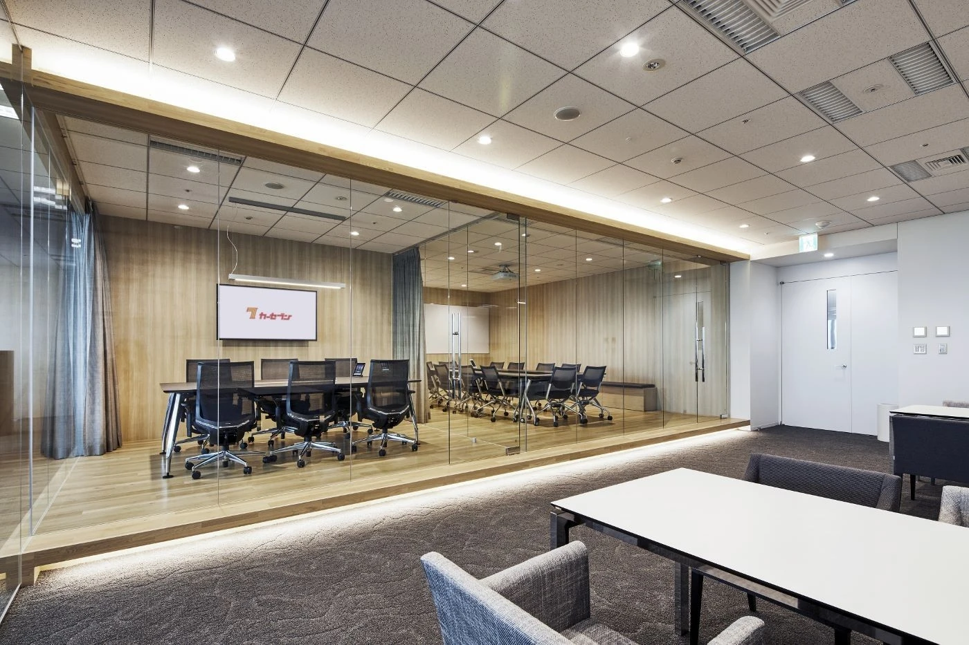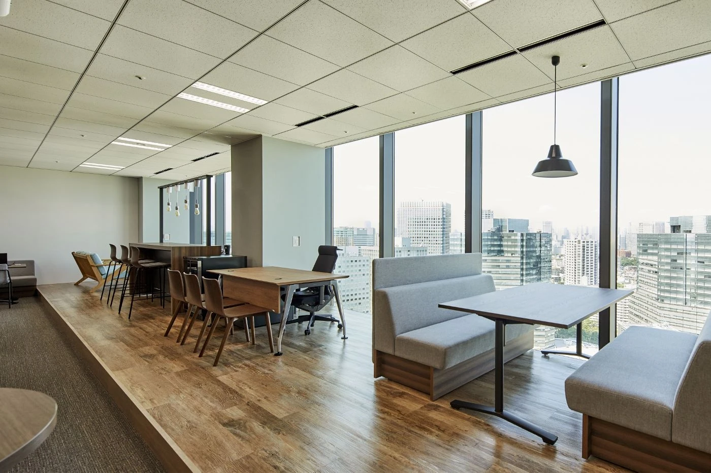 旧オフィスでは全席固定席でしたが、今回のご移転を機にフリーアドレスに挑戦したいというご希望を受け、新オフィスには様々なシーンを想定したスペースを設けました。スタンダードなワークデスクはもちろん、ソファー席、ファミレスブース席、ハイカウンター席、そしてこだわりの集中スペースなど、その日、その時の働き方のニーズに合わせて自由に選ぶことができるオフィス空間となりました。またエントランスは23階という眺望を活かし、あえて壁を全てガラスにし解放感のあるオフィスを演出。一番窓から遠いエントランスにも光がたっぷり入る、オープンで明るいエントランスに仕上がりました。窓に面しているエリアは床を1段上げて空間をゆるく区切り、間仕切を設けることなく、オープンデッキのような気持ちよく過ごせる空間になっています。