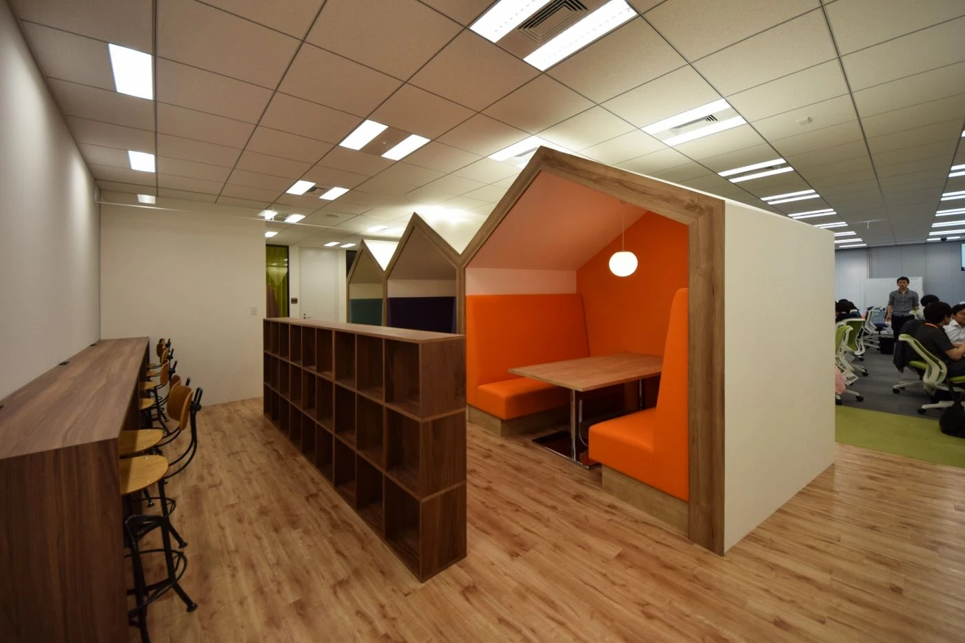 ITで未来を変えていく時代の牽引企業として、未来的かつ先進的な企業イメージを伝えられるようデザインを意識しました。エントランス空間の壁にはタイル素材を用いつつ、全体的に間接照明を使用することで明るく上品な印象に。全面ガラスを用いた間仕切りはエントランス空間をより広く感じさせ、企業としての透明性を感じさせます。ワークスペース内は自由な働き方ができるコワーキングエリアや、すぐにミーティングが行えるファミレスブースなど様々な働き方のシーンを支援できるようなデザインにし、随所にオレンジやブルーなどポップなカラーリングでコーディネイト。ハウス型のミーティングスペースを造作するなど遊び心溢れる空間を演出し、一人ひとりの創造性を刺激するオフィスとなりました。